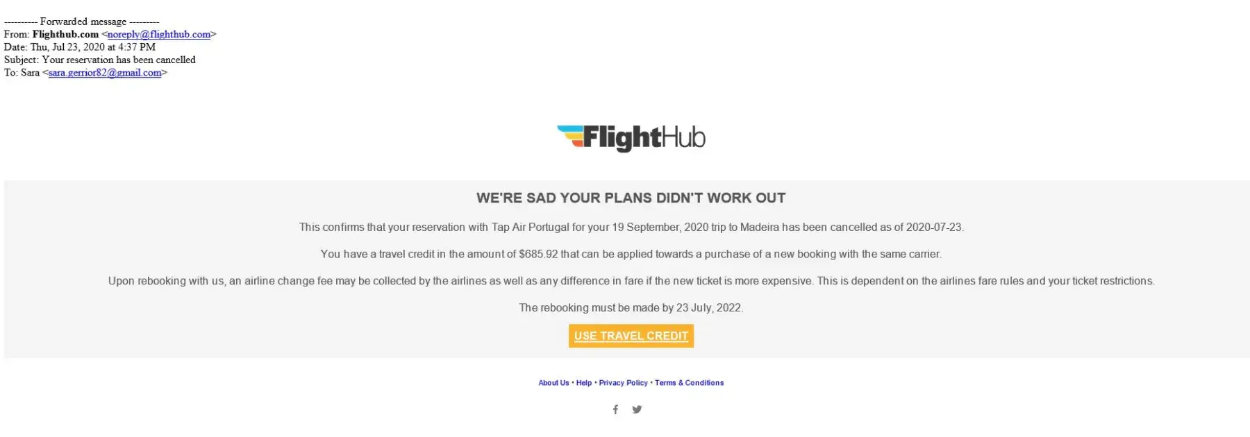 On July 23, 2020, we received an email from FlightHub notifying us that our Tap Air Portugal flight was canceled and that we have a credit with the airline.