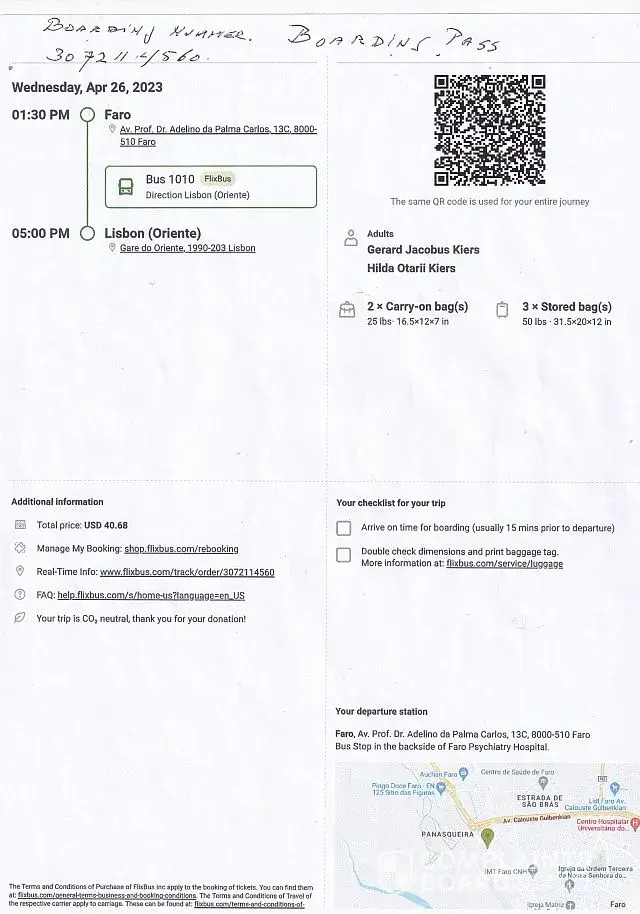 We stopped there for quite some time. Finally, we departed again, still following toll-free roads and traveling at a low speed (a small car in front was leading the bus). Eventually, we arrived at the bus station near Gare do Oriente, 35 minutes late. Since we needed to travel further to Rhaiana da Costa, we had already arranged a taxi in advance (booking reference: [protected], priced at €127.81, Top Tours). According to the contract, the taxi would wait for up to 20 minutes after the scheduled arrival time. However, since our bus arrived 35 minutes late, we missed the taxi and had to take another one, paying an additional €127.50.