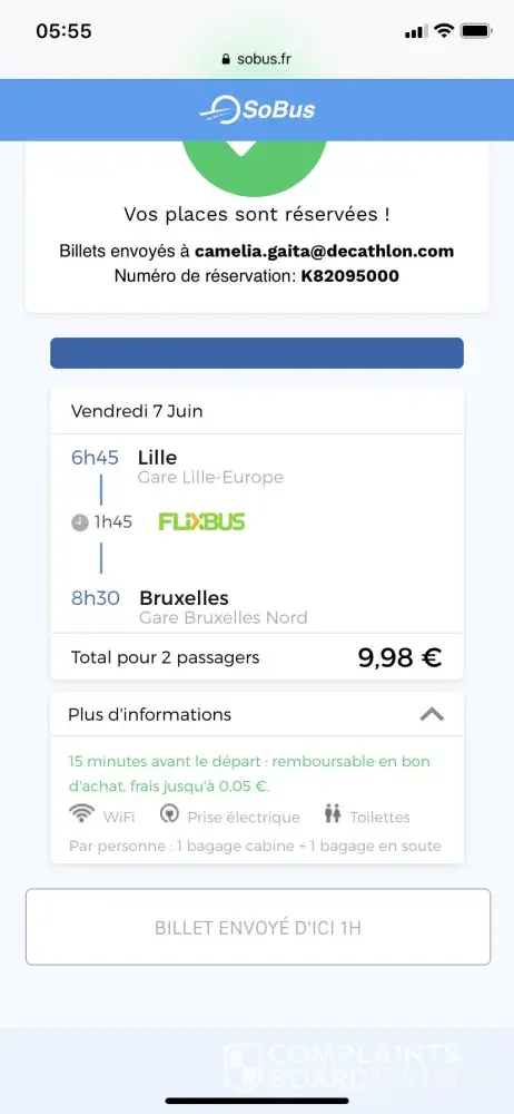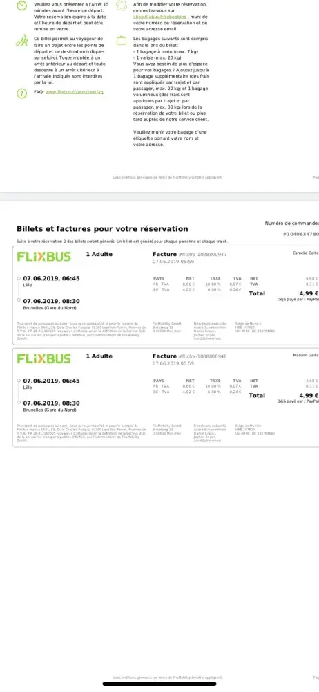 My name is Camelia Gaita. I've booked 2 places LIlle-Zaventen for 07.06.2019 at 6 in the morning with the reservation number: [protected]. The night of 06.06 to 07.06 at 01:38 I recevived a message with the cancelation of my bus. In the morning at 05:00 I called Flixbus to help me with a new solution in order to not loose my flight. I didn't receive any help on the phone, but alone I found another solution to arrive in Bruxel gare du nord and from there to the airport. I booked again flixbus for: Votre réservation (#[protected]) comprend les trajets suivants :