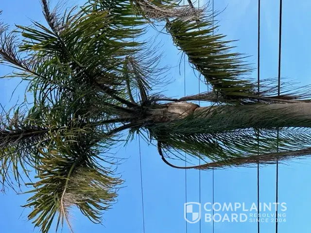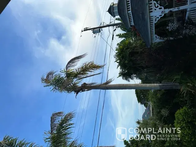 Desired outcome: Reimbursement for having to cut down my healthy palm tree due to the negligence of your Line Clearing Crew.I am traveling from Friday, July 7th to Sunday, July 30th. My email is [protected]@aol.com. My cell number is [protected]