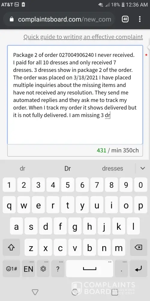 Package 2 of order [protected] I never received. I paid for all 10 dresses and only received 7 dresses. 3 dresses show in package 2 of the order. The order was placed on 3/18/2021 I have placed multiple inquiries about the missing items and have not received any resolution. They send me automated replies and they ask me to track my order. When I track my order it shows delivered but it is not fully delivered. I am missing 3 dresses.