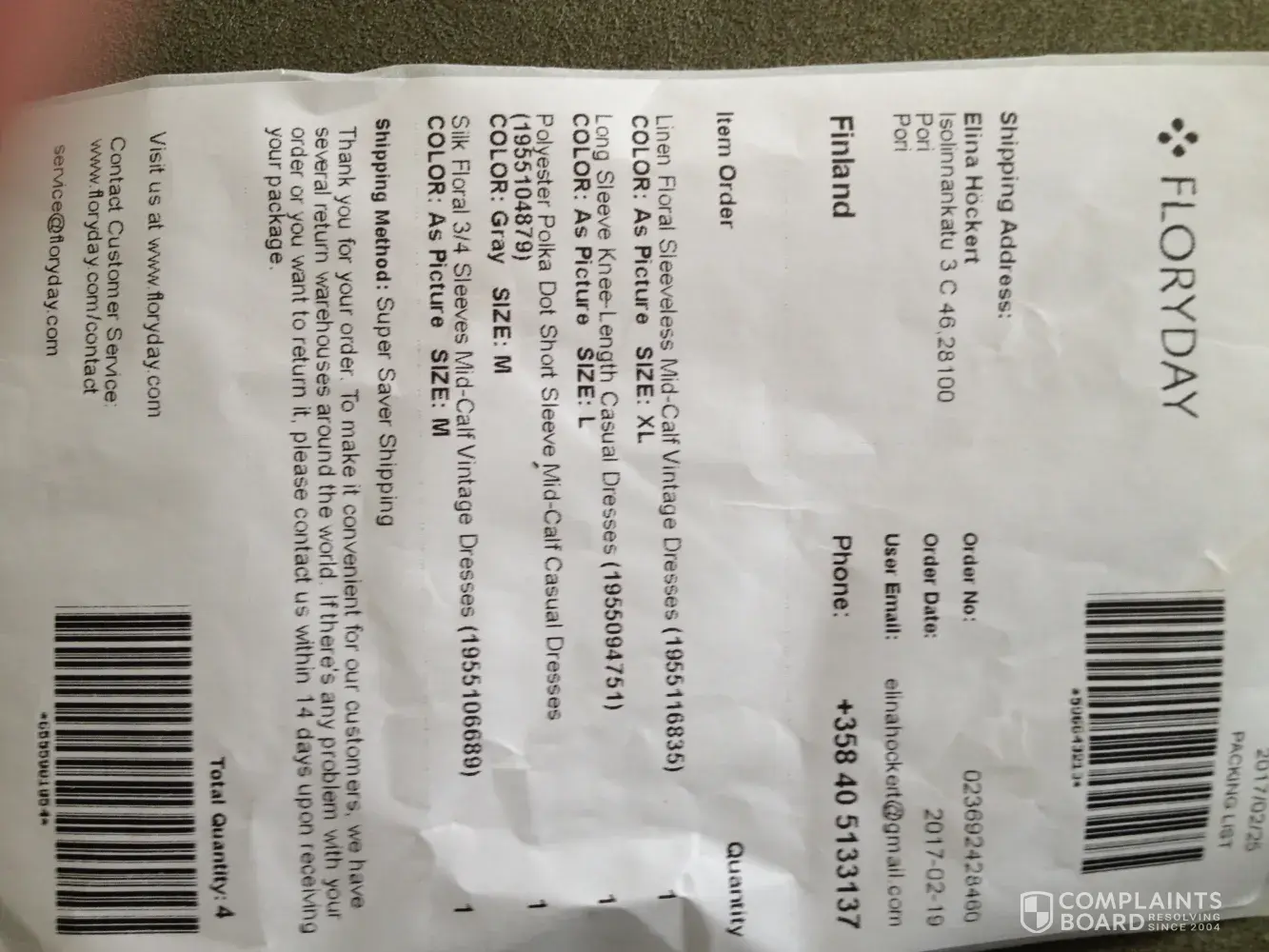Wish I had also read these comments. Never ordered online before and this first experience was a disaster. Dresses did not even resemble the picture and the fabric was cheap and nasty. Customs duty doubled the cost of the order. Have asked for a refund and to return dresses. No response. Big scam do not use Floryday