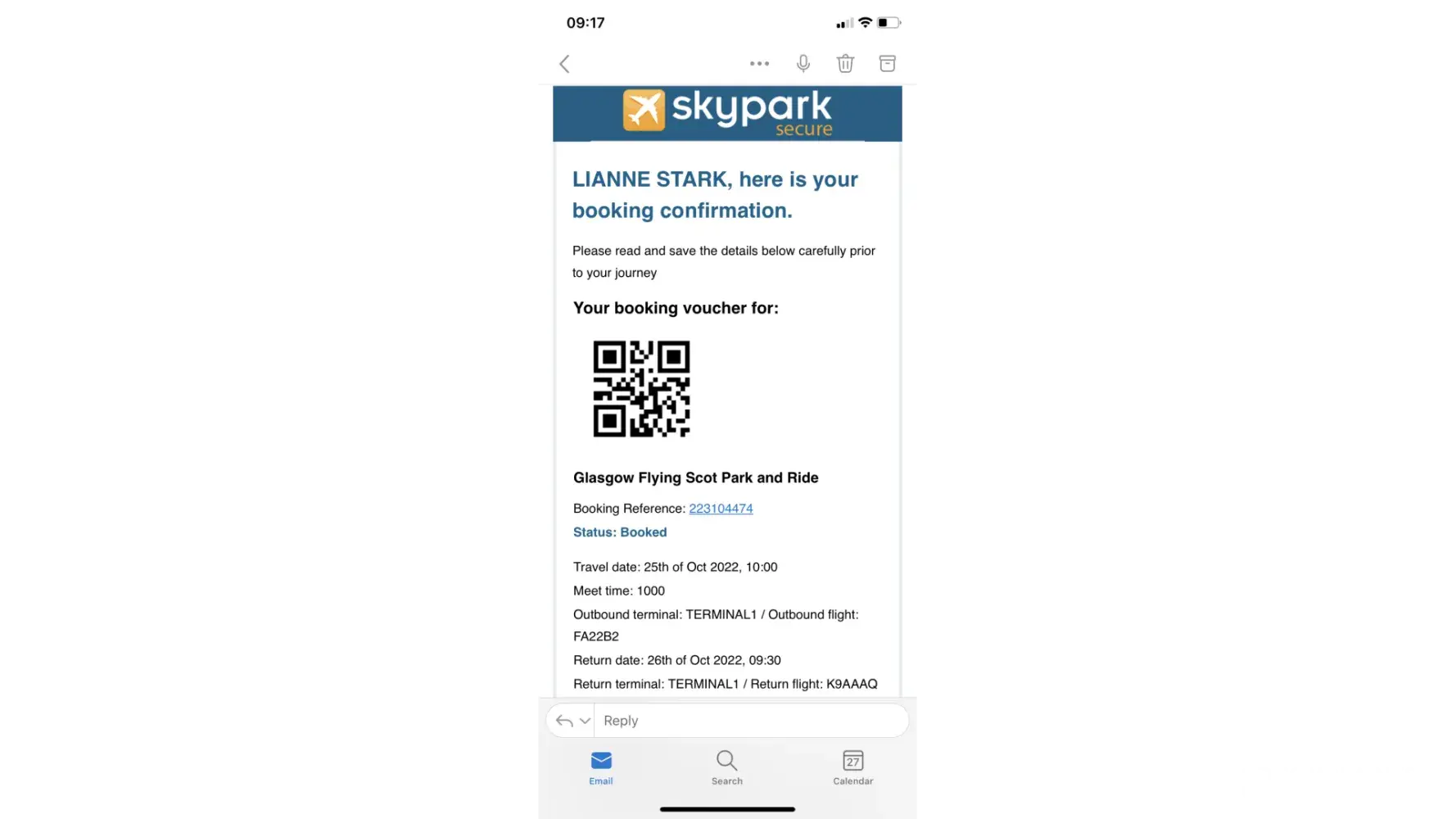 35.28 - SkyParkSecure ltd airport parking at Glasgow, booking ref [edited]