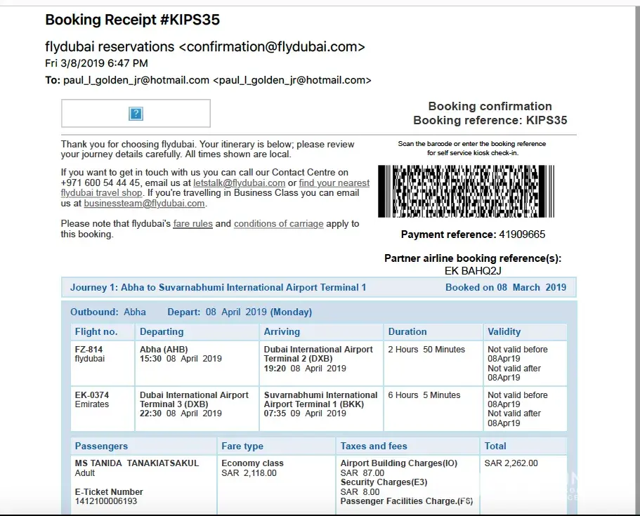 I booked this flight less than 24 hours ago, by force. I was forced to make this booking by the Thai security at the airport in Thailand, because they threatened to not allow my wife to fly to my Saudi location, unless she had a return flight. She's my wife, the visa states she's allowed a 90 day stay. Why did they force me to book this ticket? They were very rude, they made my wife cry, and told her she would not be allowed on the flight unless I paid for a return ticket back to Thailand. She had 40 minutes before the gate closed and I had no choice. No where on her visa does it say she had to do this. Does Flydubai do this to make money off of poor unsuspecting customers? Please refund me, as I do not have this money to spare. I cannot afford to lose this money! Please help me and refund my card, my family depends on this! If I'm not afforded a refund I will report this as high as I can and take this to the media because this is not fair. I was forced to make this purchase for no reason and I expect a refund, PLEASE!