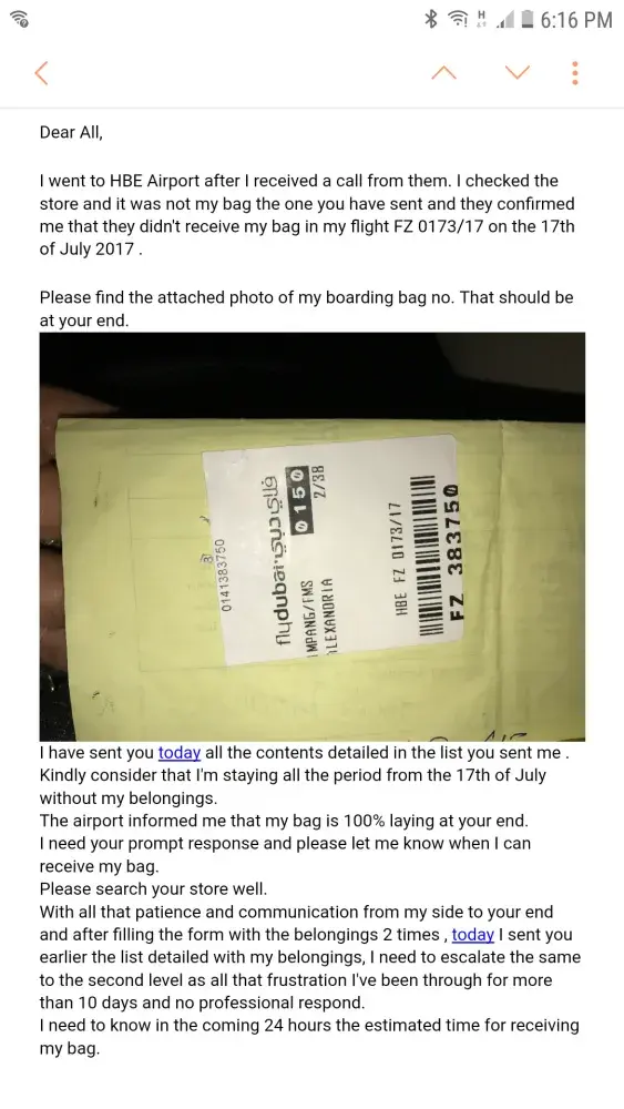 I have lost 1 baggage from 3 baggages I checked in while travelling from Dubai to Alexandria on 17th July 2017. All my important things and documents are inside that bag. I am 7 month pregnant, I don't have clothes even underwear with me because all my things are in that bag. The worst thing is, Flydubai sent us another bag and we went back to the airport which is 1 and half hours just to find out we wasted time and taxi fare. The staffs are unprofessional, no mercy, not caring for the passengers. I am tired and it's almost 2 weeks now waiting for my things. My days are ruined, I have to endure the situation. I lost the biggest bag which contains all what I need. I read the flydubai reviews from the internet and I was shocked to find out that there are many lost baggages and stolen goods. I hope to receive my bag because even if flydubai compensate for the lost baggage, it's not enough to bring the things inside that bag. So frustrating and so upsetting. All this drama in Flydubai Airport mean staffs are not professional or well trained. No appropriate system. CEO must be aware about these things. Although the tickets are cheap, it doesn't mean they can jeopardize the belongings and safety of their passengers. I hope no one else suffer like us.