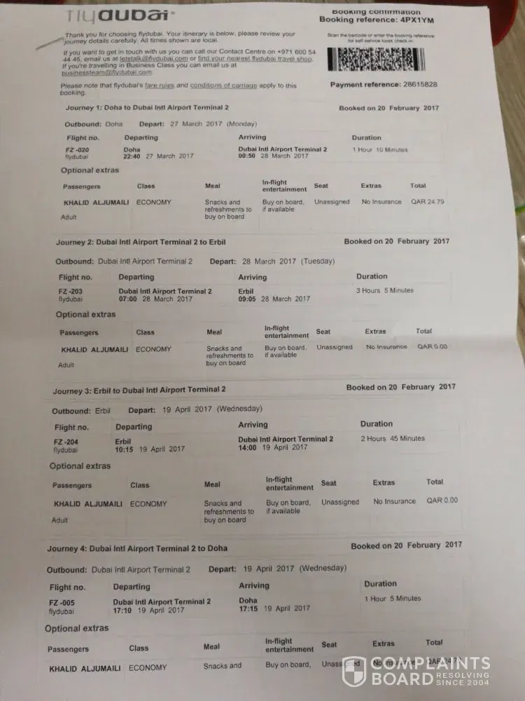 The flight from doha to Dubai the flight number FZ12 was delayed 3 hours on the 27th of March. The second flight from Dubai to Erbil on the 27th of march was delayed till the 28th of march. The flight number is FZ203. The name under these bookings was Aljumali Waleed and Mohialdeen Khawlah and Aljumali Omar and Aljumali Khaled. Also the names have been written so they are surname then forename.