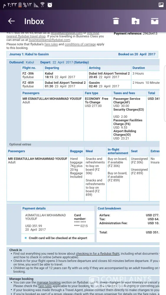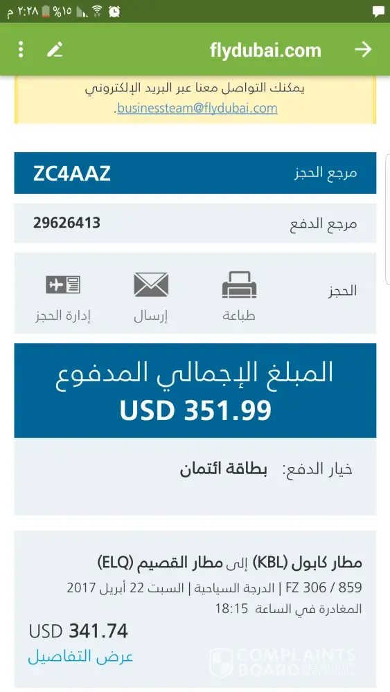 انا /المدعو عصمت الله Ù…ØÙ…د يوس٠لقد ØØ¬Ø²Øª تذكرة Ùلاى دبى بتاريخ22/04/2017 من كابل الى القصيم وقت الرØÙ„Ø© كانت 18Ùˆ15 دقيقه من كابل Ùˆ 1Ùˆ30 دقيقه من دبي الى القصيم لقد تاخرت الرØÙ„Ø© الى ساعة 1 ØµØ¨Ø§ØØ£ وصلنا الى دبى تقريبأ ساعة 3 ØµØ¨Ø§ØØ£ لقد طلبت من ÙØ±ÙŠÙ‚ Ùلاى دبى ÙŠÙˆÙØ±Ù„Ù‰ سكن Ø±ÙØ¯Ùˆ كلمت عدت اشخاص من موظÙين Ùلاى دبى رغم ذالك انا لقد اشتريت تذكرة بزيادة تقريبأ 70 دولار امريكى ØØªÙ‰ ما امن لى سكن كانت تذكرة على توق٠12 ساعة به 280 دولار Ùˆ اطالب بتعويض هذى رقم Ø§Ù„ØØ¬Ø² ZC4AAZ