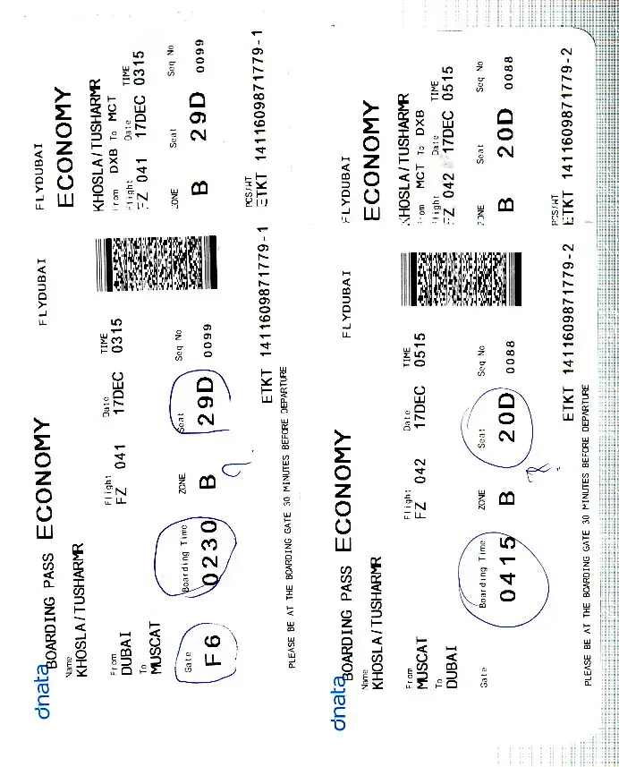 i) a full refund for original flight FZ-012 & FZ-043 Doha-Dubai-Muscat 28 March 2016;
