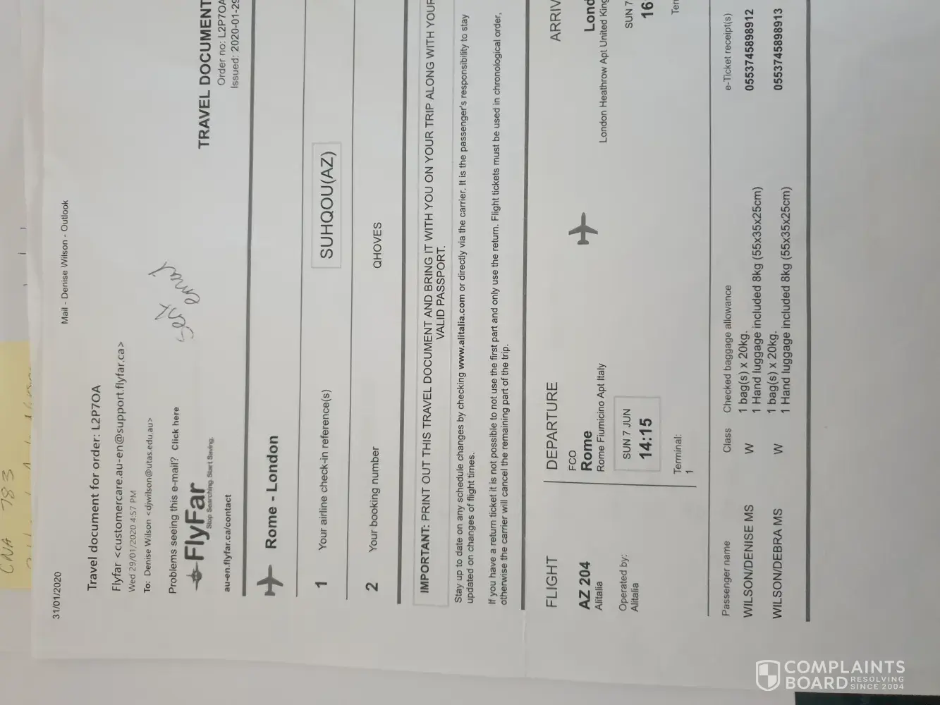 I purchased flight for myself and daughter on 29January 2020. Flight from Rome to Heathrow London Sunday June 7 2020. Flight L2P7OA, Denise & Debra Wilson E-tickets [protected] & [protected] QHOVES, Airline check in reference SUHQOU(AZ), Booking No. QHOVES, I had been receiving updates as follows, stating still waiting for Alitalia to process, now no contact and no refund received, I have copy & paste last email received: