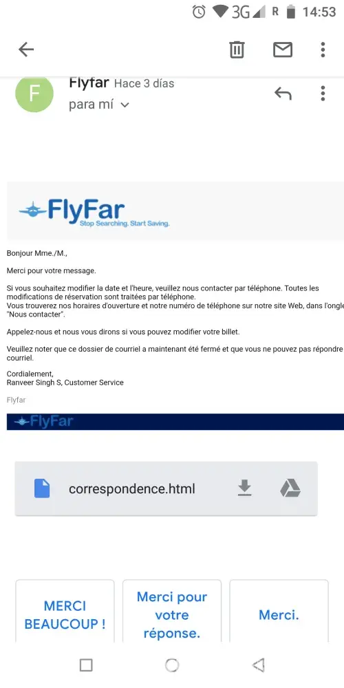 Assign insult to injury three days prior to departure I received a generic email speaking about get ready for your flight.