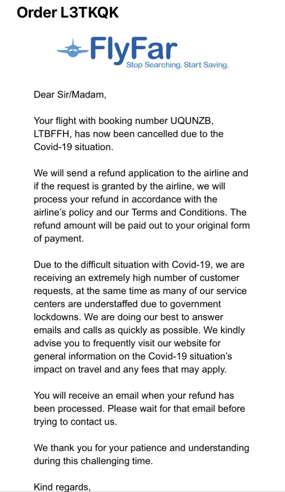 In addition to COVID-19 the actual flight I booked was also cancelled and I received an email from FlyFar asking if an alternative flight was ok which was indirect. I advised no. On top of this I reminded them I could not fly anyway and sent them the details of Virgins cancellation policy and asked them to cancel the flight. This was the 2nd email I sent and got no reply.