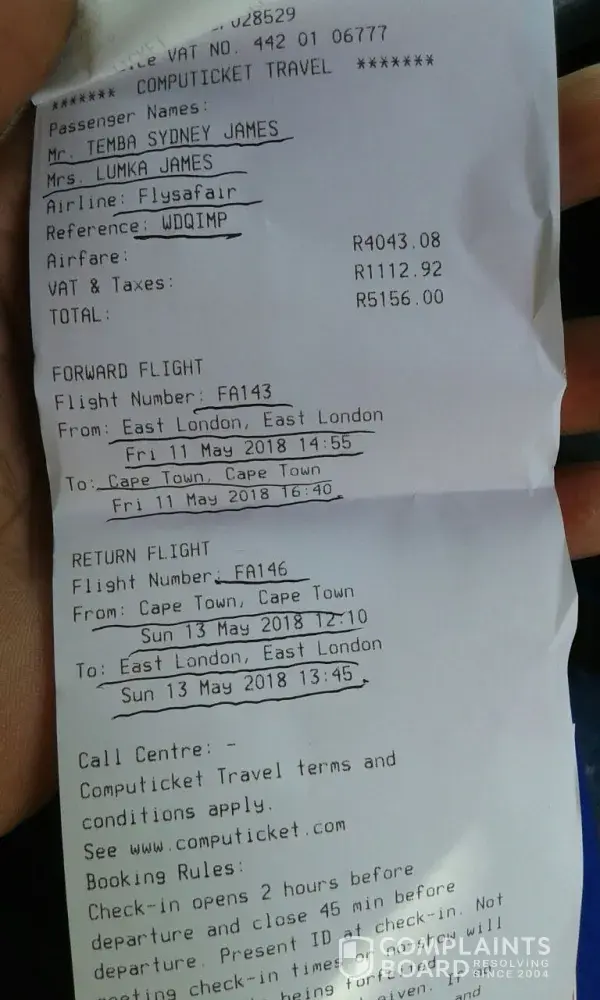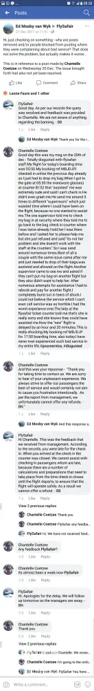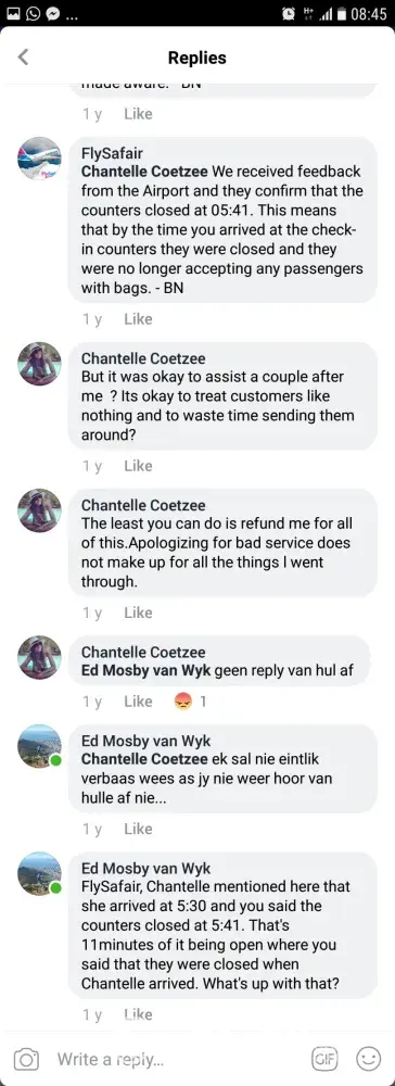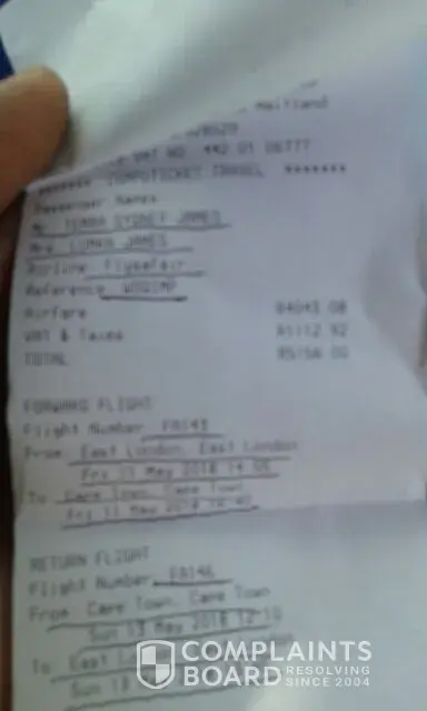 I would appreciate some compensation for these mishaps please. At this point in time I am unwilling to fly with flysafair again as I am afraid these things happen again.