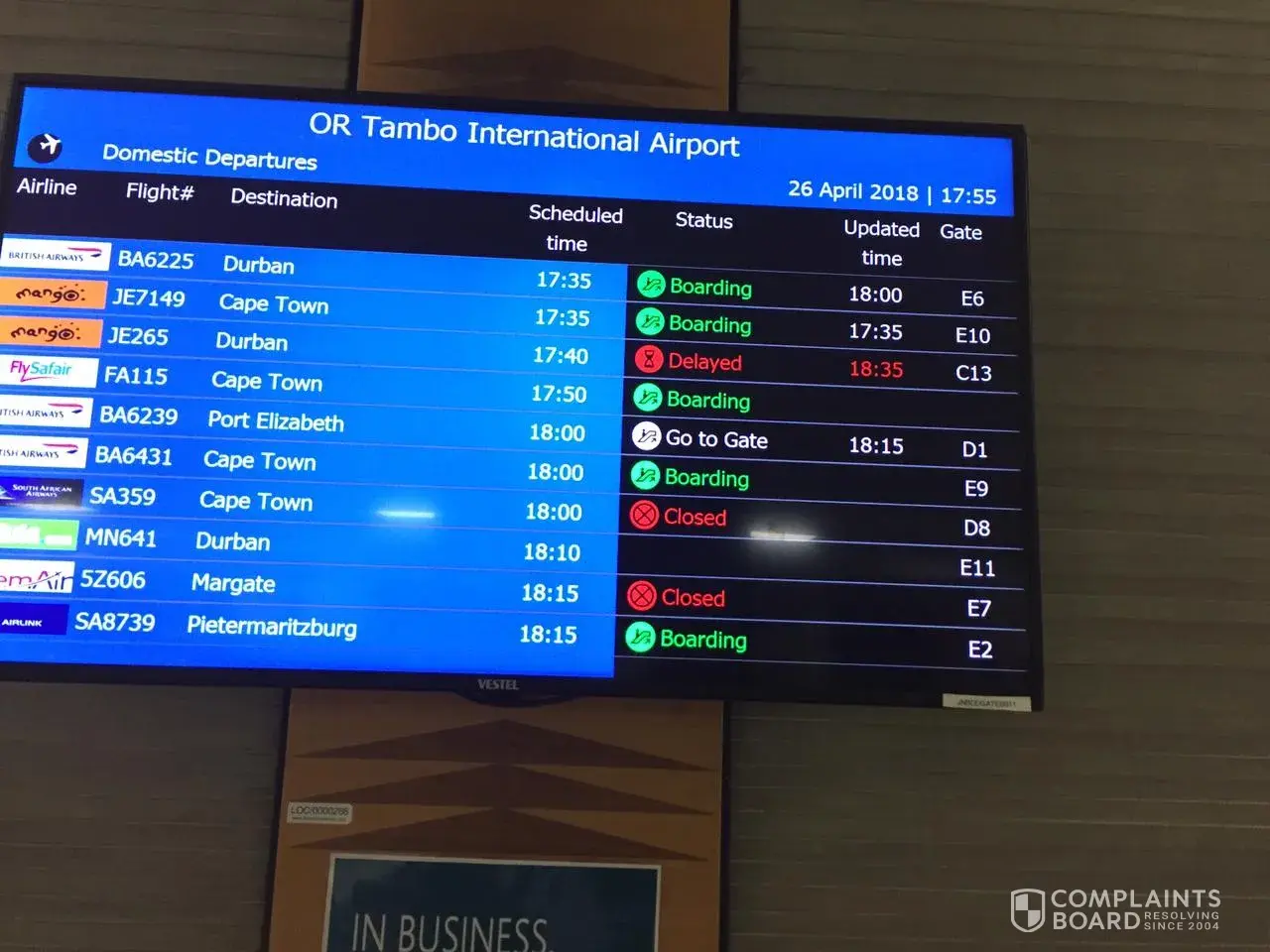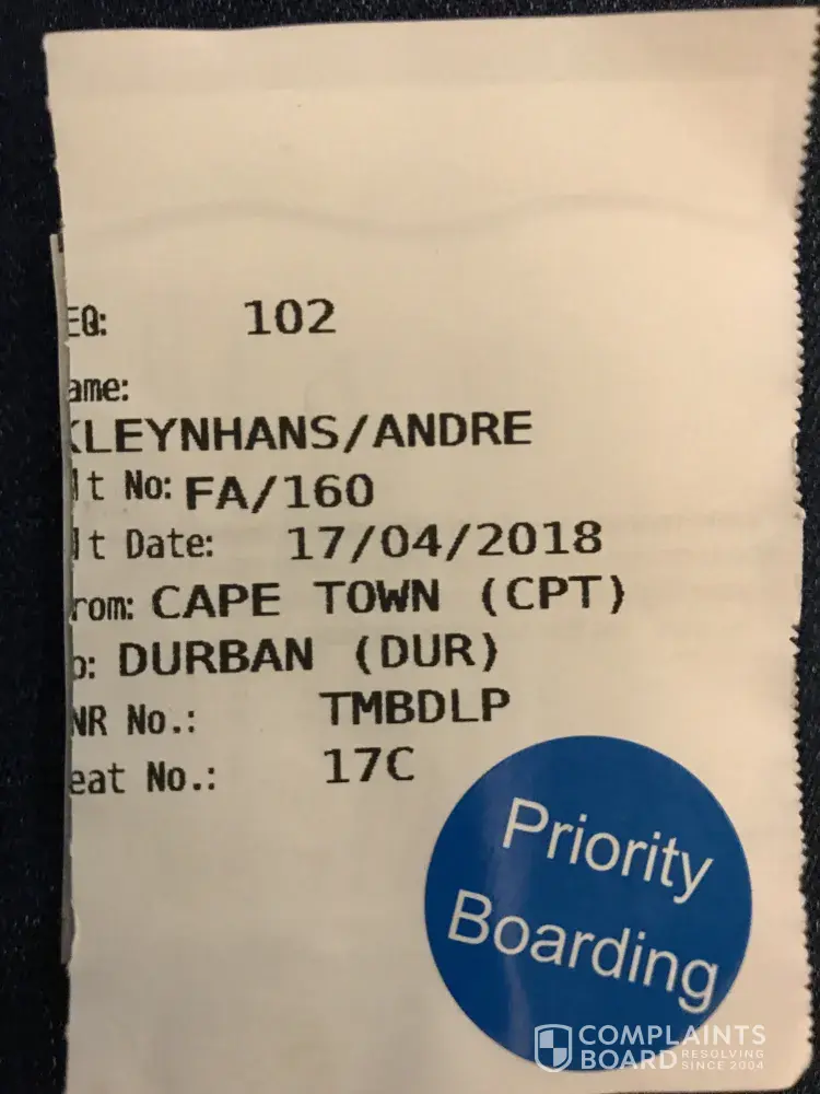 Another incidence was a red eye flight booked for April 26th 2018 at 05:45 from Cape Town International Airport to OR Tambo International Airport, Johannesburg, booking reference: pvrgpc.