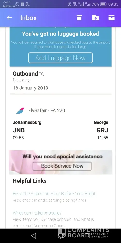 The following complaint refers to the poor baggage service received from Safair on the 26 of March 2018, when departing from OR International Airport to Cape Town International. Flight Number: FA121