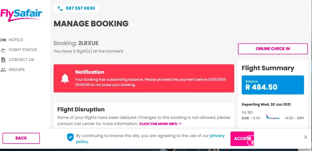 When I got to Lanseria I was told to call the call centre, when I called, I was directed to submit this claim via the website which I did.