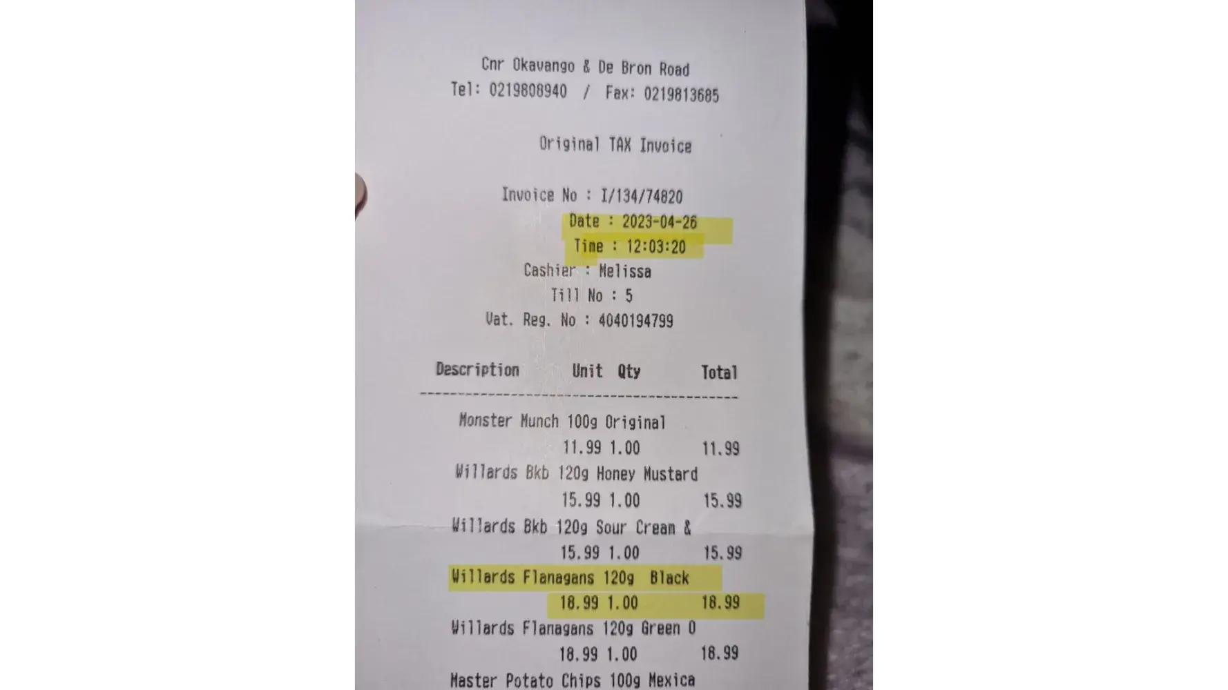 Hi, I purchased a bag of the Flanagans black pepper from Giant Hyper, Brackenfell, Cape Town, South Africa on 26/04/2023 @12:03, the same day while consuming the bag of chips, strange stick-like pieces were found in the handful I had grabbed. I am not sure what it is as it is hard to break, so it is definitely not crisps, although it is covered in spice.