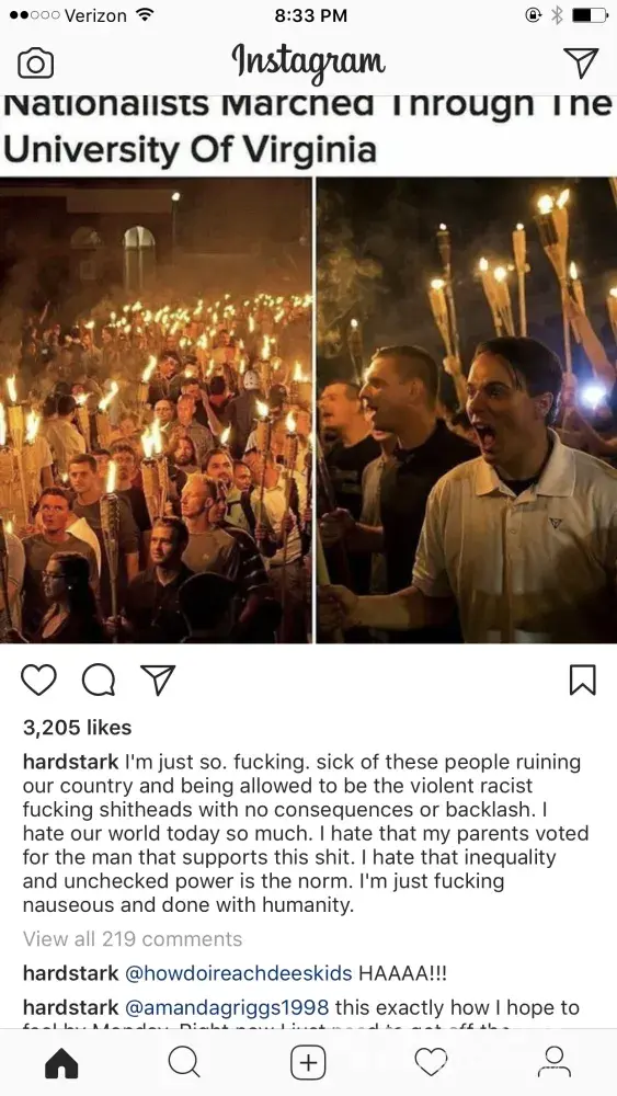 Today, on August 12, 2017 on Instagram Georgia Hardstark posted an article about the riots in VA that happened. Her comments, while understood, were quite hateful and extreme. Being a follower of her IG and a fan, I simply commented that continued hate speech and rhetoric would not help the situation and that we should all do our part to help portray love, peace and understanding. I didn't think it necessary -- with what I'd already said - to specifically indicate that I too was discouraged and disappointed about today's riot.