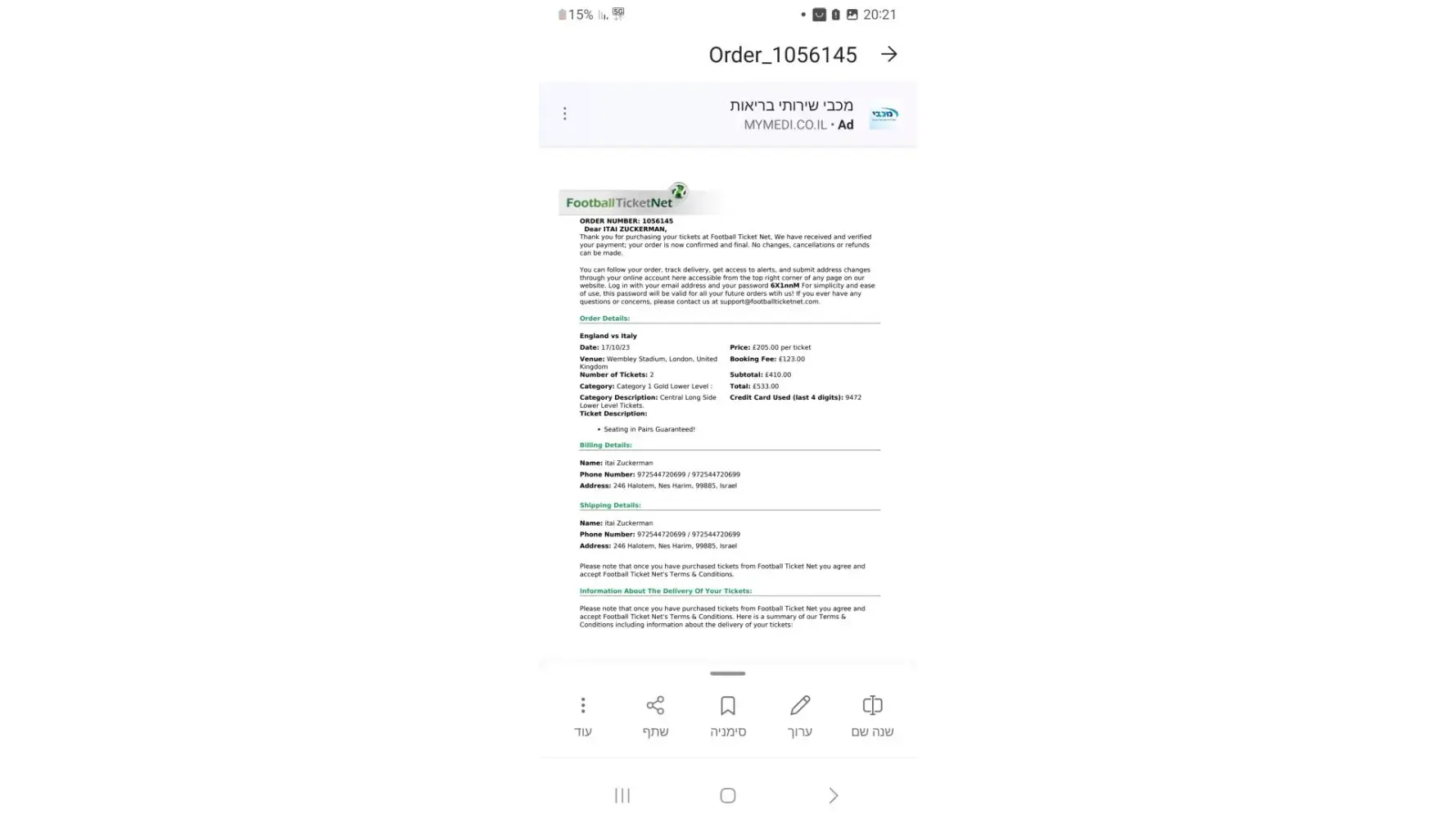 We bought tickets to a football game In Wembly Stadium, London, England vs Italy, on Oct 17th. We came to this game especially from abroad.The tickets were for me (Itai) and our 13 years old son (Yoni). When we got to the stadium that evening one of the tickets did not work. We tried to get help from Footballtickets staff by email and by phone. They tried to help but didnt susceed. At the cashier we were told the ticket was a fake. Finally, We couldnt enter the game (I couldnt send in a 13 years old child alone, a child that never attended a football game and doesnt know the language and the culture). In the time that passed we were in touch with the staff, they keep telling us they are checking the event. Two months past and they are not giving us the refund and compensation.