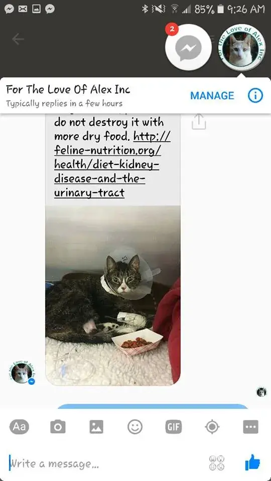 About a day or two after her second surgery to remove the leaking kidney, I had posted an update to her donors and our friends discussing what had happened with our cats surgery, etc. For the Love of Alex proceeded to message me on FB bashing us for feeding our cat dry food, yet again. She also bashed our doctors and mentioned that our "ego" was getting in the way of our cats care. She did not offer us ANY help, just hurtful words and wasted time. I am so angry, because this woman should not be a 501c3 and I plan to take action against her. If you are reading this, I beg you to do the same. I have never in my life met anyone as cruel as her.
