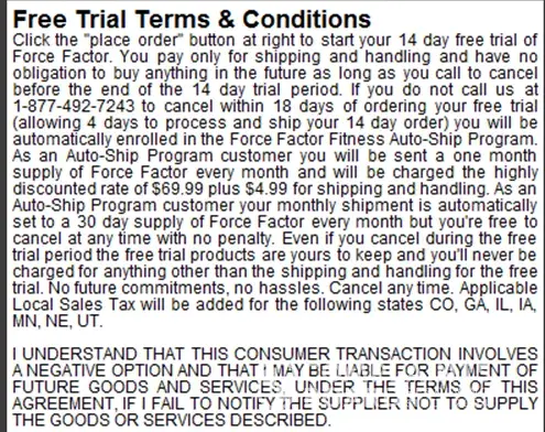 I accepted to take the "free trial" for the product "Force Factor". The product in hindsight appears to be a complete scam. They initiate the process with a phony "quiz" as to whether or not a person qualifies for the "free trial" I would later ask the supervisor I contacted by phone, if anyone actually did not qualify. He refused to give me that information. Force Factor does send you a 14 day supply of pills for the the shipping fee which you pay. The only reason they charge you for shipping the product is to secure your credit card information. Its very obvious in hindsight. Their add is very lengthy and since the average person only consumes or reads 24 to 50 words of any typical add. They know full well. You will never notice that they have a stipulation.