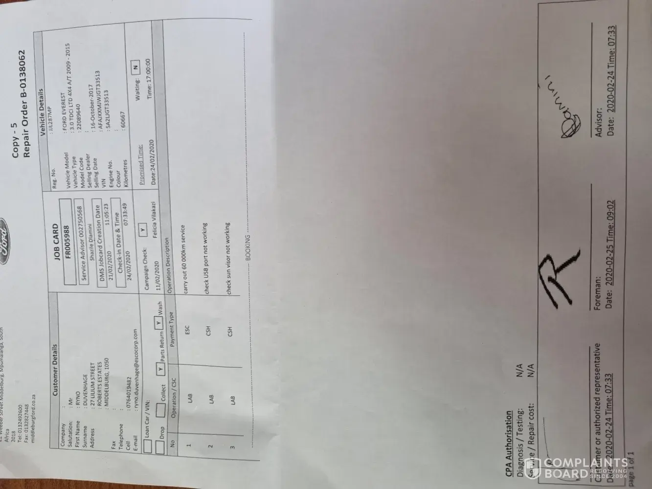 The manager and warranty officer was already out of office, could not raise my concerns with them. I really expect Ford to sort this out for me, issues which were reported at previous services were not fixed properly now I need to pay for work that were supposed to be done first time when issues were raised.