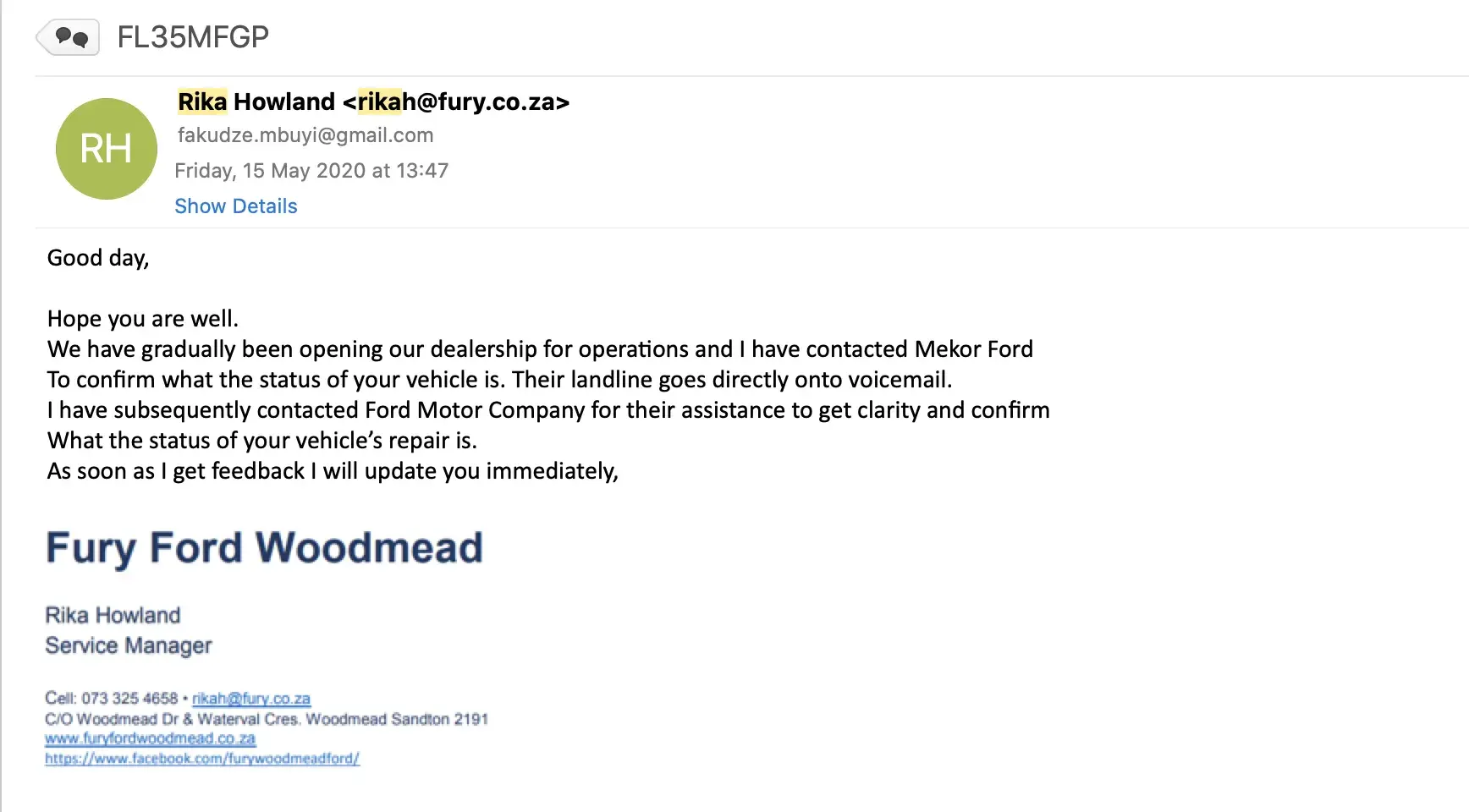 I received an email from Rika on Friday the 15th of May 2020 at 13:27 after she had struggled to get hold of me on my mobile phone (screen shot of her email is attached in this email), I responded as soon as I could informing her that I was on zoom calls that day and was not available on my mobile phone. I also received a call from Mekor Ford that week informing me that they are now open again and will continue "investigating" the situation with my car.