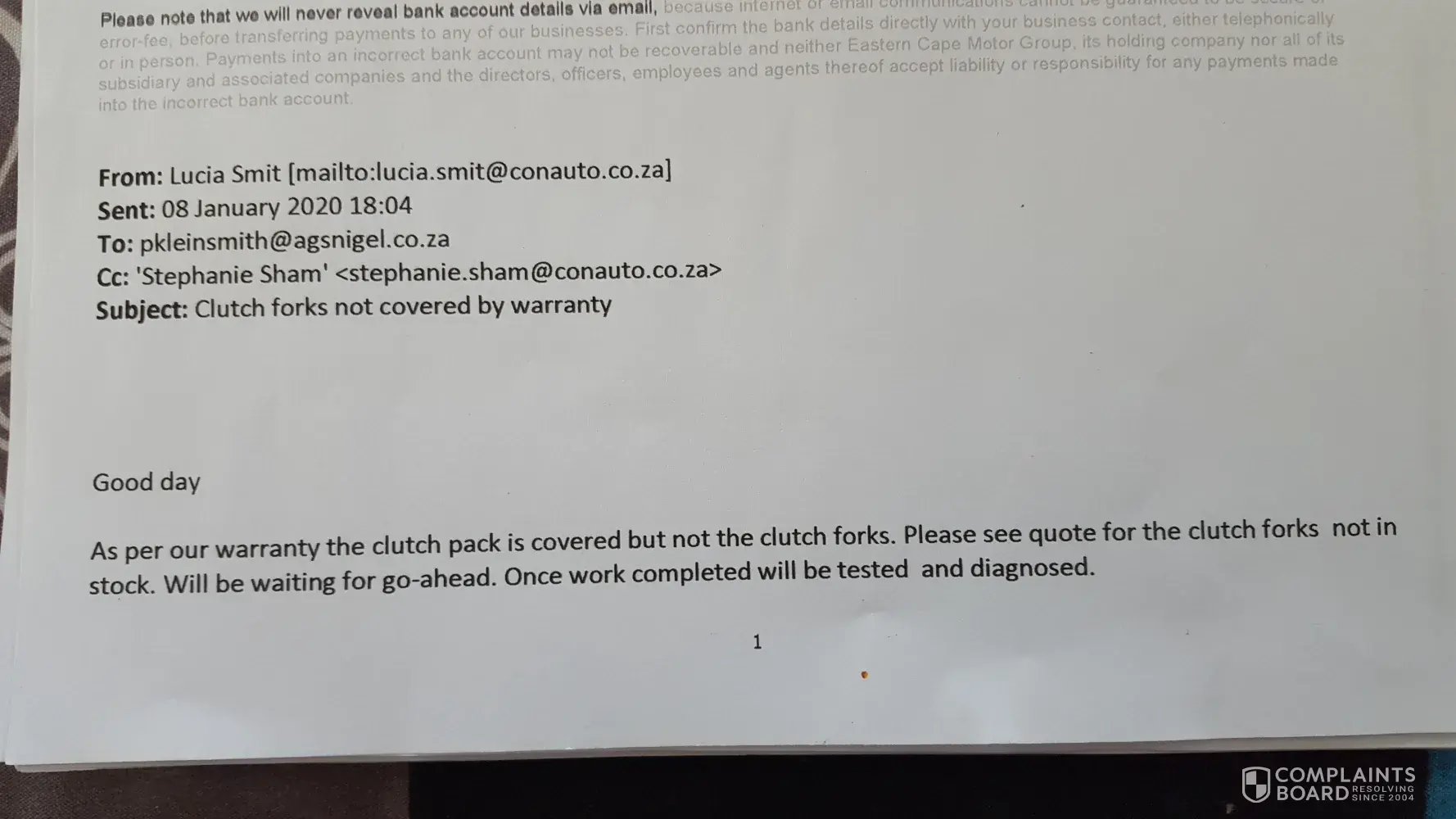 I then explained that I'm not a car technician nor a mechanic and would never have tampered with brakes, the engine or any lubricants relating to my car. The last institution that was responsible for my car was the Ford dealership in Woodmead where I had the last service done (on the week of the 28th of November 2019), the brakes were also replaced last year at Fury Woodmead and they had also replaced my engine which had collapsed due to a factory mechanical fault.