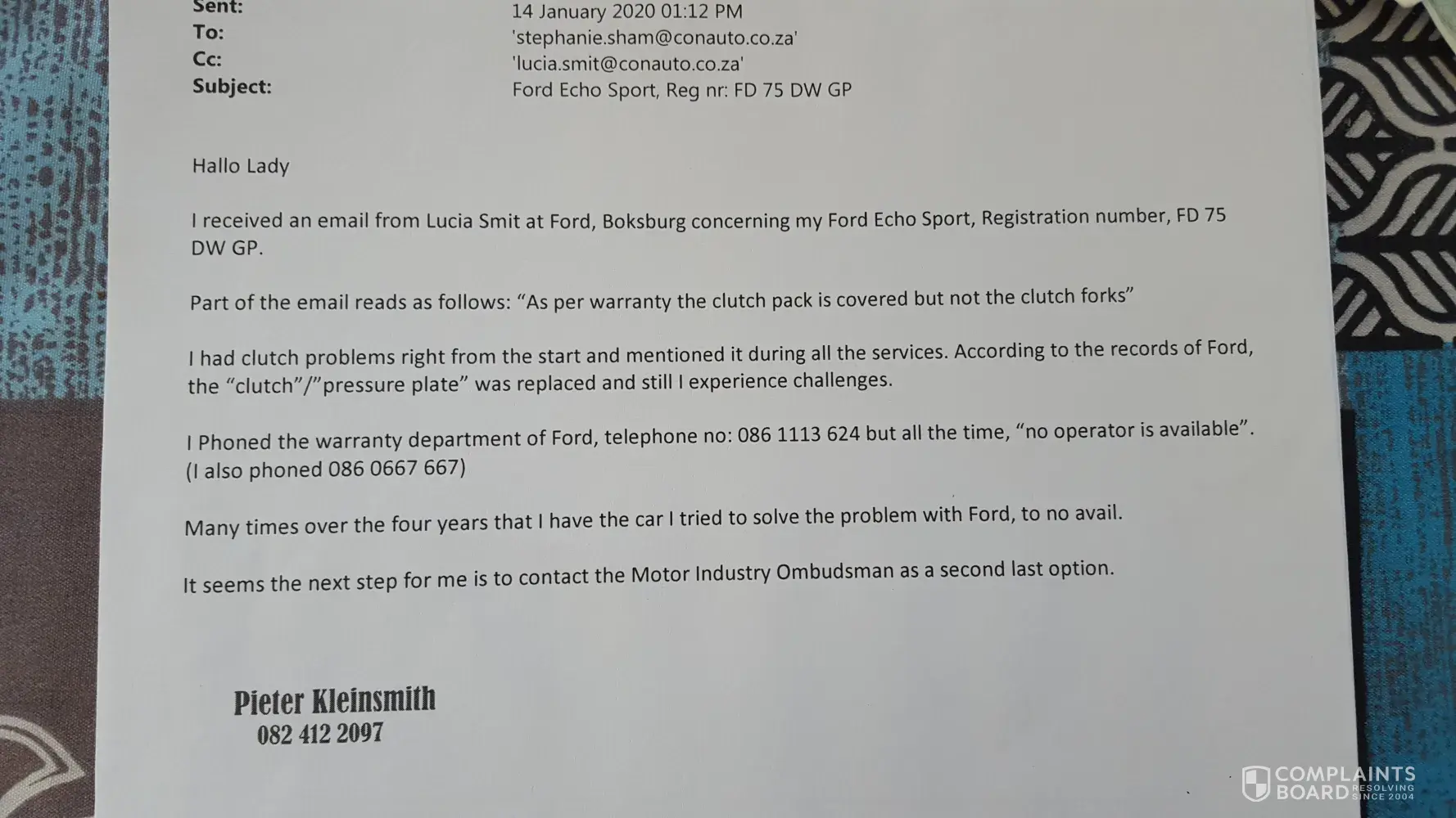 In 2016 I bought a Ford Eco Sport Automatic and from then I had problems with the gearbox/clutch. It was sent back a few time and 09 January 2020 I went back as there was a problem again with the gearbox. It is 19 August 2020 and they have sitl not resolved the problem. They also sent me a letter saying that the part the broke is not covered under the warrenty and I need to pay all the costs of the repairs/replacement. They are letting me use a courtesy car (Ford Figo Manual) apparently that is all they have, which is not ideal for me as I had a left leg operation and that is why I have anautomatic car. Please will Ford SA buy the car from me (or replace it), so that I can purchase another vehicle that is suitable for my needs. It is 7 months of waiting. This is really ridiculous.