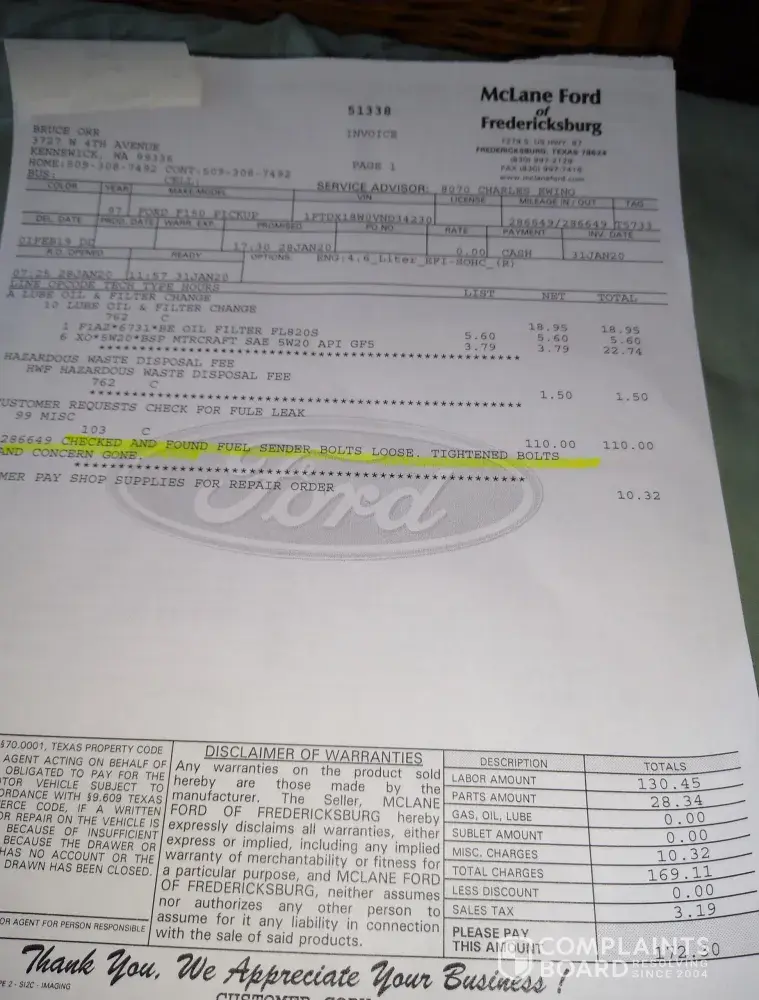 My wife travel to Texas after Groove Ford of Denver had installed the gas tank, on our truck. Unfortunately gas was observed leaking when the truck was filled up with gas in Fredericksburg Texas. The local Ford dealership (see the attached file) identified the problem with the bolts securing the fuel sender bolts being loose. This email is requesting That groove Ford pay for the faulty work done in the amount of $121.32 and the unscheduled stay over at the hotel of $131.65 for a total amount of $252.97