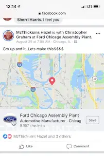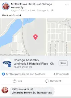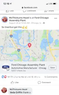 Hello, An employee/temp employee by the name of Sophia Griffin is constantly posting pictures/videos on Facebook of her driving/transporting vehicles from the CN Harvey Rail Yard to the Chicago assembly in Chicago heights. It is very dangerous for this individual to be working for Ford and posting pictures/checking in/recording all while driving as thi...