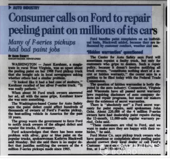 "Taking a vehicle to a Ford dealer or contacting Ford Customer Care about the problem ends up with the typical response that the vehicle is not under warranty for this issue or it was caused by environmental issues like Bird Droppings or Acid Rain.