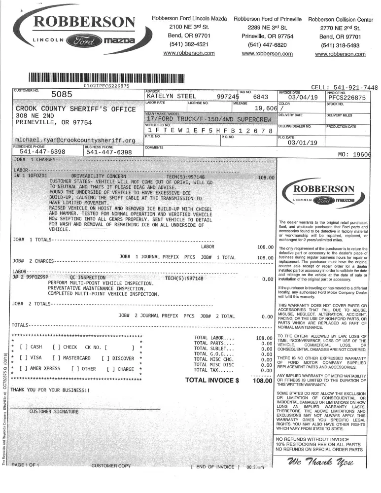 My name is Michael Ryan, I am the Special Services Division Commander for the sheriff's office. Last year we purchases 2ea 2017 Ford F150 Law Enforcement SSV pickups. Last week we had a deputy arrive on scene of a crime and was unable to put his vehicle in park. I turns out this was due to ice build up around the transmission sufficient to prevent the...
