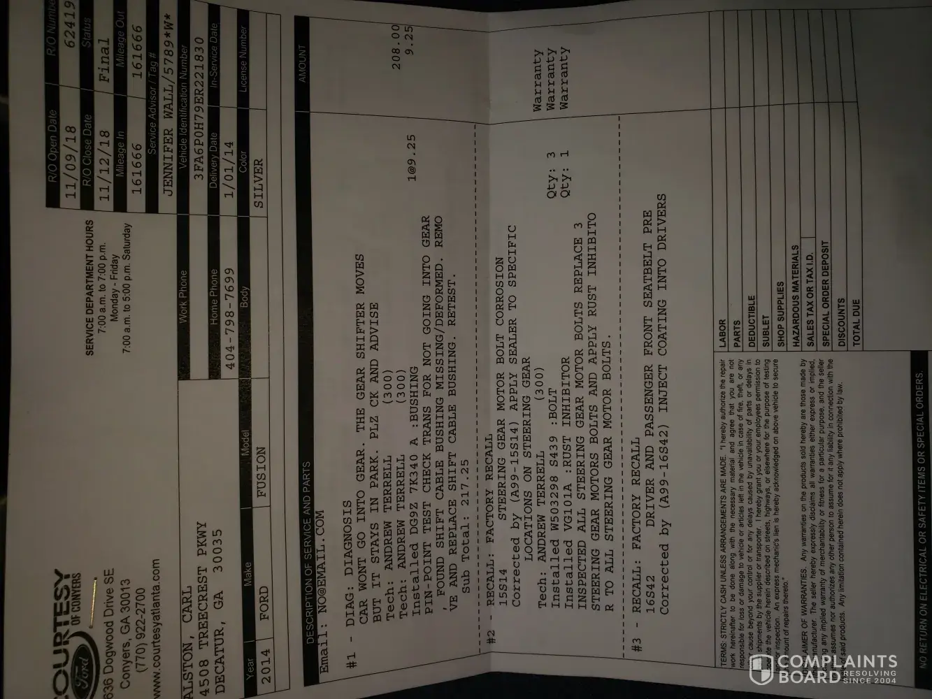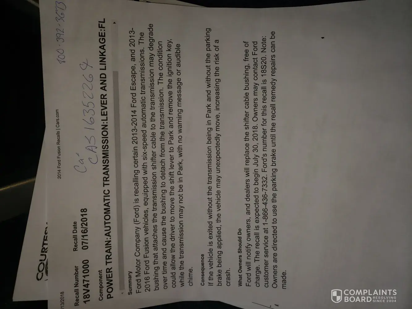 Recall 18S20. Per this recall the cable bushing detaches or degrades. Per the Courtesy Ford dealership it was the cable bushing that was bad causing damage to front end of car. Per Ford rep my VIN was not affected but the technician diagnosis says that is not true. I paid $253.00 out of pocket for this. Bill from dealership and recall information attached in photos.