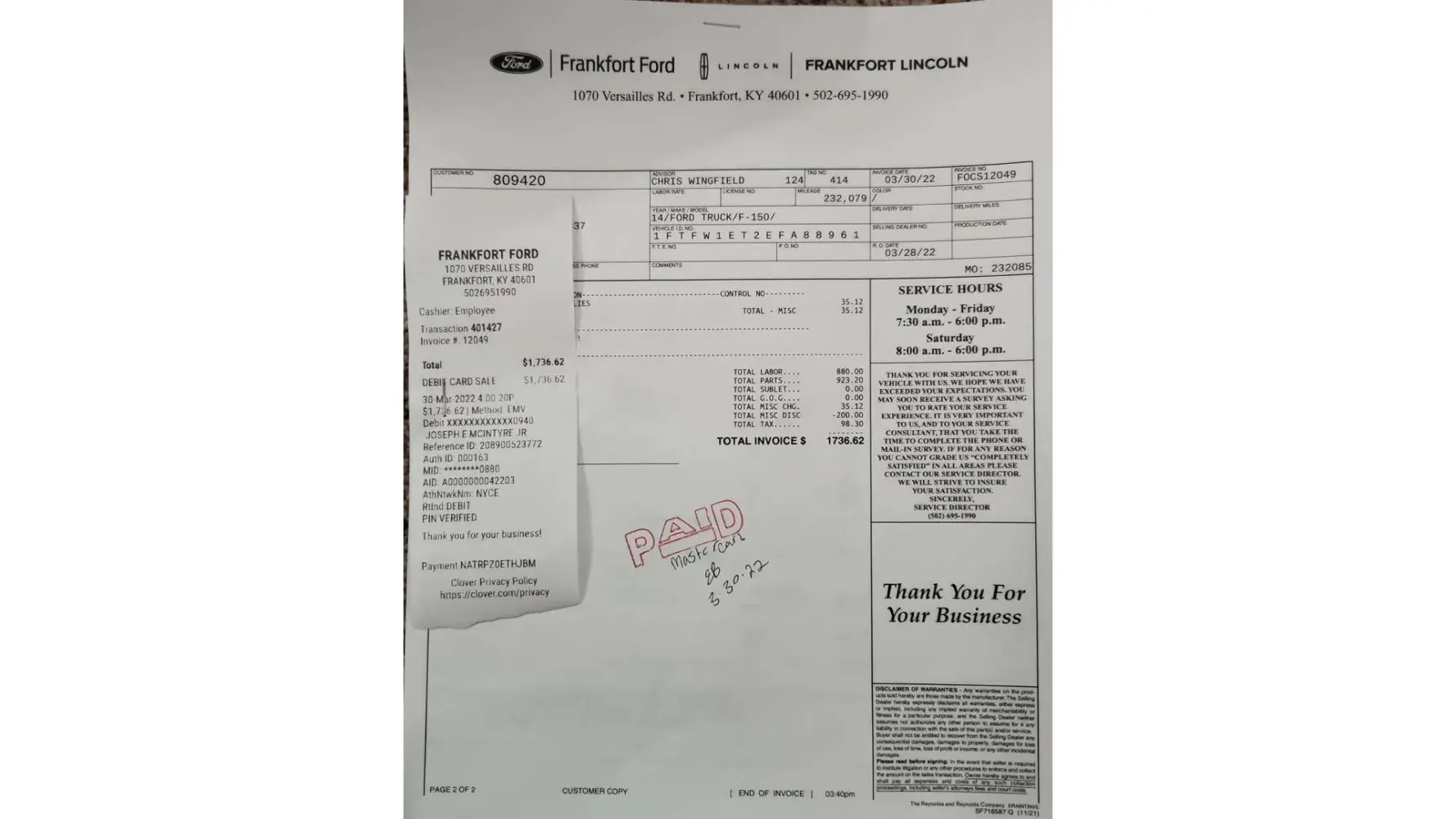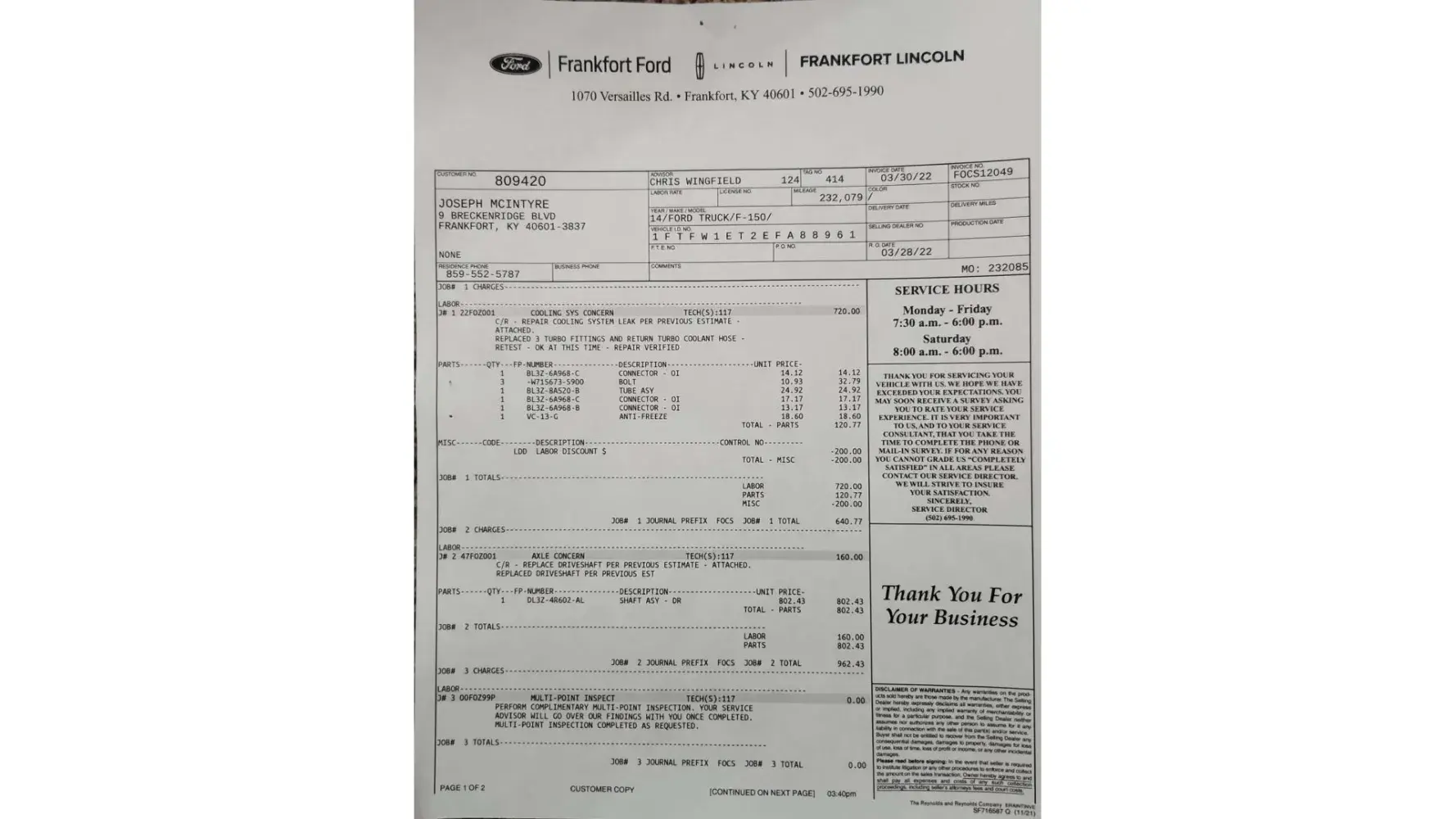 I had my truck taken to them for a blown head gasket there teke told me the EGR system needed plugged hr said he is would do it for 1500$ then calls and says the brand new turbo I had just put on from Napa was no good and he would sell me a used one for 500$ so I go to pick my truck up and the lady says sir I have no paperwork on your truck .I said it is right there I was told to come pay for it and get the keys.she said she knows nothing about it to go talk to the mechanic.he said yes it's done give me the money here are your keys I asked for my turbo and he had taken it home .I said I wanted it back it's brand new it only had 4hrs on it.he said ok he would bring it I could pick it up tomorrow.so I get my truck made it a block it locked up . So I call he sends a wrecker I go to pick my new turbo up and it wasn't the one I had bought from Napa it was so some dirty old turbo that come from AutoZone he stole my turbo any way even though this was done at the Ford dealership they in will not do anything to help fix truck this guy has had it like 5-6 times and it still does same thing it is locked up and can't drive it and he no longer works for them