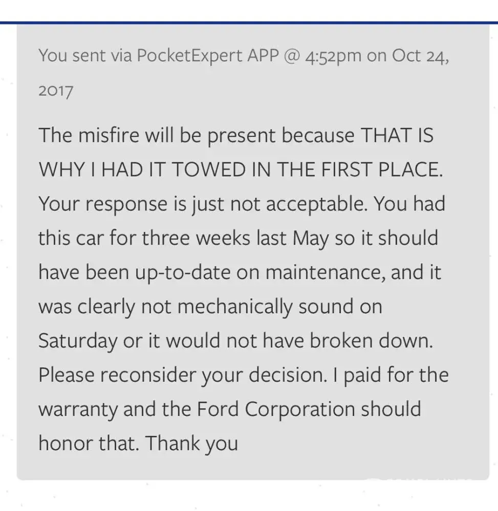 My response: "The misfire will be present because THAT IS WHY I HAD IT TOWED IN THE FIRST PLACE. Your response is just not acceptable...it was clearly not mechanically sound on Saturday or it would not have broken down. Please reconsider your decision."