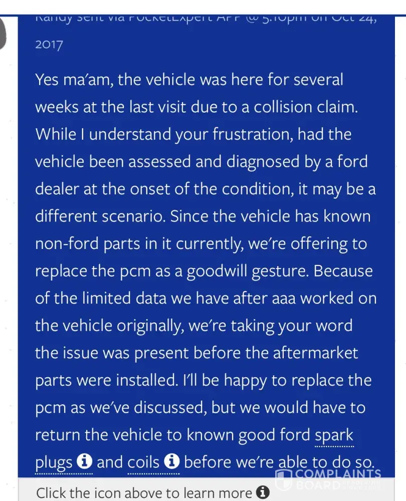 I responded by asking if AAA were to replace all the original Ford parts, would Ford then replace the PCM etc [meaning: the PCM, spark plugs and coils, ALL of which are covered] for free as per the warranty? If so, I could have the car towed back to them.