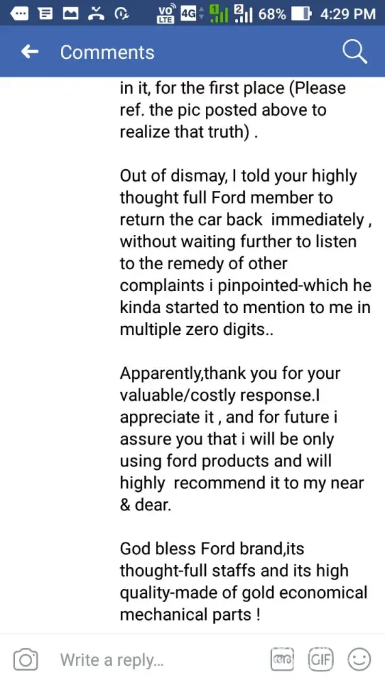 Please refer complaint number #9216, 19, 20 etc in the below link- to realize the high quality testing results of Mr Ford (INDIA) as shown by them in the posted video.
