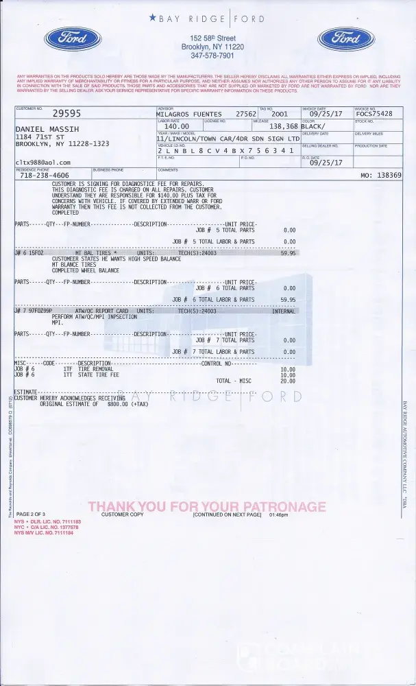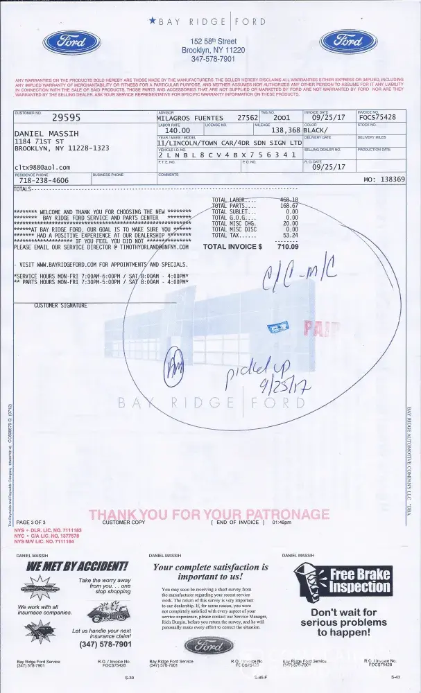 On September 25 2017 I brought my 2011 Lincoln town car to bay ridge ford on 152 58 St Brooklyn NY to do the following repair