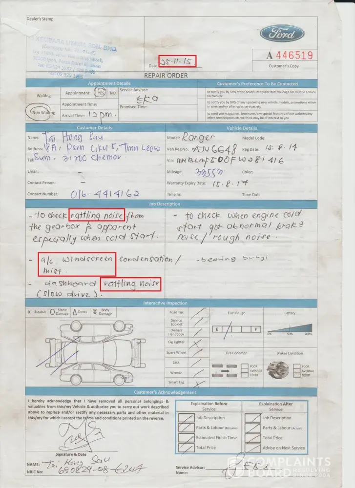 I bought FORD RANGER 2.2L XL LO-RIDER Car model in year 2014, exact date was 16 August 2014. The chassis number is MNBLMFE00FW281416, Engine Number is P4AT1190709.In year 2015, I realised that the car wasn’t function in a proper way, the windscreen and engine had some issues. I sent my car to the workshop – SNS Kembara Utama Sdn Bhd (Ford dealer in Perak State) and seek help from them to find out the root cause. I have been sending my car to SNS Kembara Utama Sdn Bhd for almost 3 years [protected]), same problem still existing and all the technicians failed to solve it out. Even the director (Syed Nasrul Azmi) of SNS Kembara Utama Sdn Bhd failed to provide solutions and good explanation to me, I am wondering how SNS got the dealership from SIME DARBY or Ford Motor, the quality is so ……….(I can’t describe it). I attach copy of repair copy for your reference, how ridiculous Ford Motor failed to repair one minor issue after 10 times trying!
