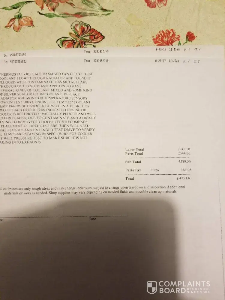 I bought a 2005 Ford F250 Powerstroke superduty from Wagner Ford on April 28, 2017 with the assurance from the salesman whose name is Chase that it had a brand new oil cooler and EGR cooler system on it with a warranty after the 2004 F250 I had first test drove was spewing oil from the passenger side of the motor when we returned from the test drive. On August 20, 2017 my 2005 F250 Powerstroke stranded me in Alma, Nebraska with only 14, 000 miles being put on it since it was purchased and had to be towed to Wagner Ford in McCook, Nebraska to be repaired, since I was still under the assumption it was under warranty. They quoted me $2, 200.00 dollars total to fix it and get it running again. From August 21-25 Chris from service dept. at Wagner Ford has called me numerous times stating they believed it was the water pump, the radiator, the fan clutch and finally the EGR and Oil cooler system that were bad. I approved them to do work on the pickup except the EGR and Oil Cooler which I asked if they were under warranty since my salesman had assured me during my purchase that those parts were under warranty and brand new. Chris said he would check and call me back. Chris called me back a couple hours later and informed me that they were not under warranty and my bill was now going to be between $4, 700.00 to $5, 000.00 dollars total after the oil cooler and EGR systems had been replaced with tax and labor. So not only was I lied to and mislead to believe that the parts were under warranty when I purchased the vehicle I was also misled on my quote to fix the pickup. There is no resolution in sight and they will not allow a payment plan to be set up but did suggest that I come in and fill out a credit card application for Ford Credit Services which I could use to pay part of my bill if I were to be approved. During the time my pickup has been in the shop I was able to rent two cars from them both 2016 Toyota Corolla's on August 23rd of 2017 I hit a deer going to work at approximately 6:15 a.m and killed it which also damaged the car. It broke and cracked the grill and bumper cover of the vehicle. The Harlan County Sheriffs office was disbatched and took report of the damage and all information. At 8 am on August 23rd I informed Wagner Ford of the accident and asked what they wanted me to do. They wanted me to bring the car back and exchange for another. I returned the car and picked up the next rental and went back to work. On August 25th of 2017 I recieved an email from State Farm addressing myself Dalton Swopes that they had received my claim for the rental car which I did not send. Wagner Ford in McCook, Nebraska took it upon themselves to claim my name and send a claim into State Farm on my behalf. Also on the 25th of August Wagner Ford called and requested their rental car back so I returned it and they wanted me to pay their $500 dollar deductible for their dealership insurance to pay for the rental car damage knowing full well that they had already fraudulently sent a claim to State Farm claiming to be me to cover the rental car that was damaged from the deer on August 23rd of 2017.