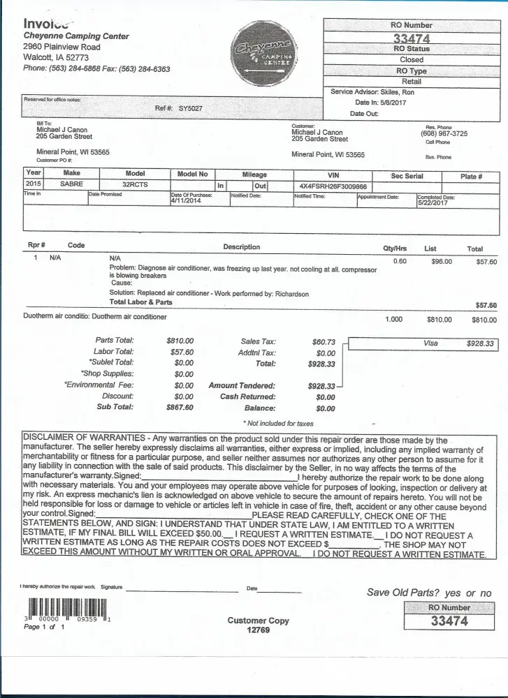 " Hello Lisa. We purchased a 2015 Sabre fifth wheel brand new from the factory. The air conditioner has never seemed to work properly right from the start. It has been blowing the breaker and freezing up a lot since we have owned it. I nursed it along until now. We went to Branson Mo. for two weeks this spring and the first time we went to use it, the compressor would trip the breaker right away. We never got it to work so we spent two weeks without air on vacation. On the way back home to Wisconsin, we stopped at the dealer where we had purchased it at Cheyenne Camping Center in Walcott Iowa and had it replaced. They said that the compressor was shot and that it was not installed properly from the factory. The frost sensor was not even hooked up and there was a hole in the duct that allowed cold air to go back up into the coils. The replacement cost us $928.33 and we feel that we should be reimbursed for this out of pocket cost. Please let me know your thoughts on this. Thanks for your help in this matter.