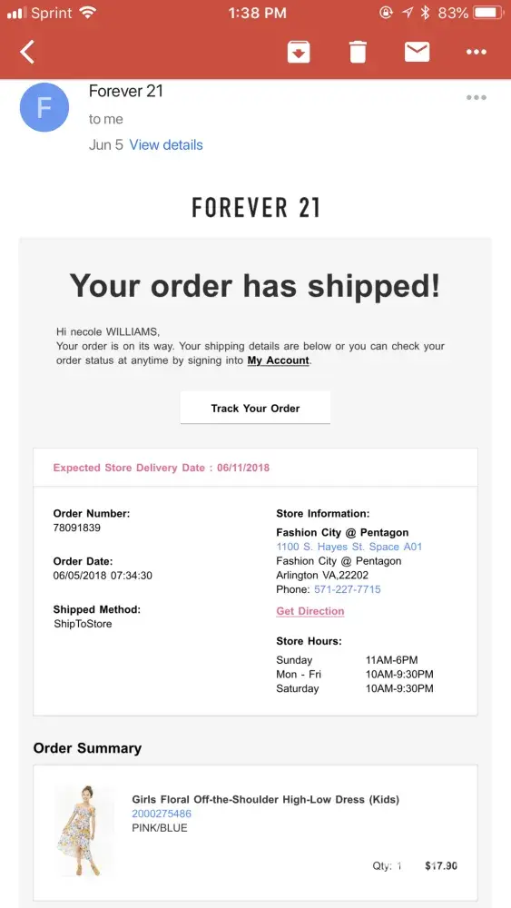 I ordered two shirts with a gift card online. I changed my address because I moved a couple months ago and completed the order. I checked my order a day later and it is being shipped to my old address in Florida and I live in New York now. I called the contact us number and it was no help. I still don't know what I'm going to do about it. it is terrible that it did not change my address. forever 21 customer support is no help!