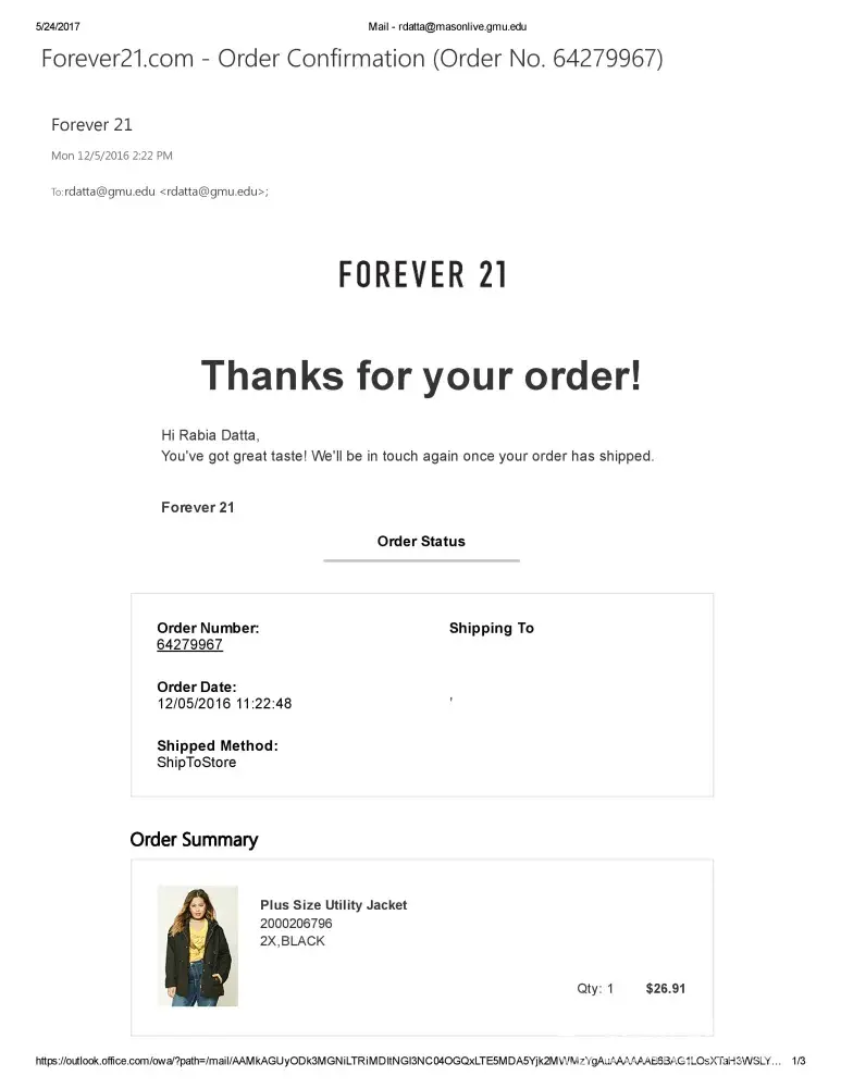 I placed an online order to be delivered to a local Forever 21 store back in December 2016. I never received an email stating my package was ready for pick-up. The order was placed on December 5, 2016, so I went to the store to inquire about my order on December 14, 2016. I was rudely turned away by an employee, since I did not have a shipment confirmation email for my order. She advised me to wait for the email and then come back. I was leaving town for the holidays on December 16th, so this was disappointing.