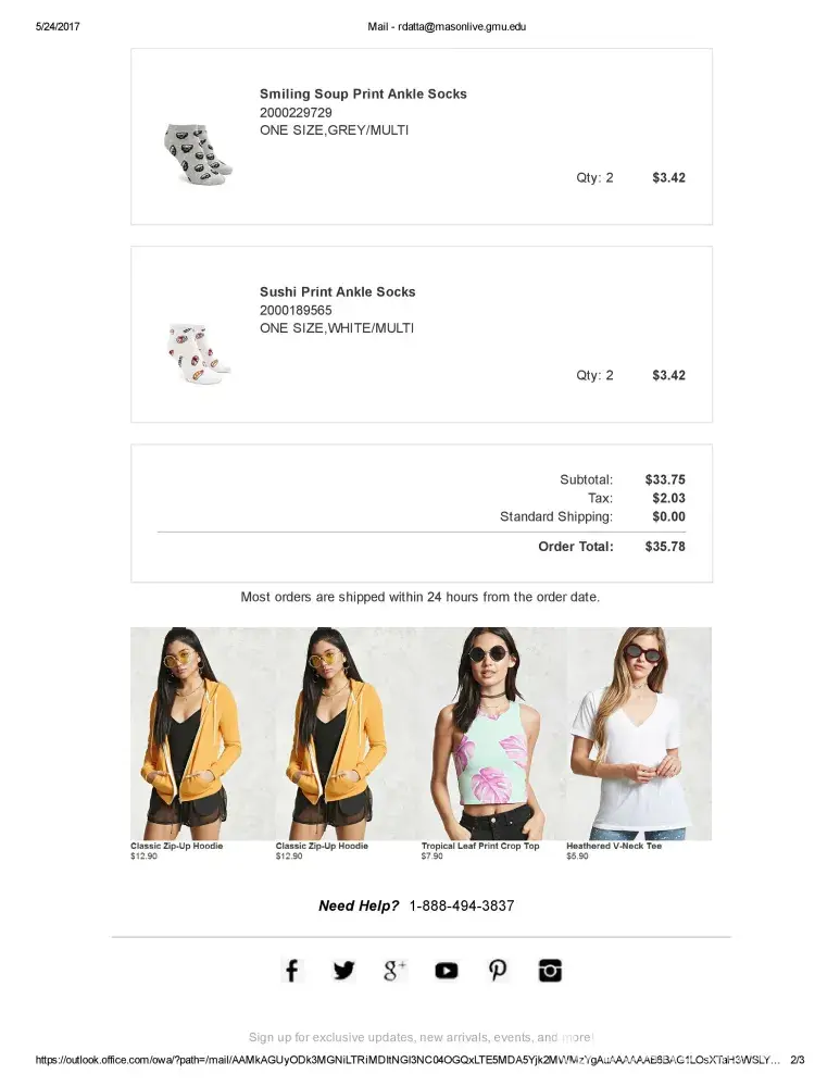 I have contacted customer service over 7 times now and no one has been helpful to me. The last person I spoke with said there was an "investigation" happening about this matter. It is now almost the end of May 2017, and this matter still has not been resolved. I have never received any emails about this from Forever 21 since I placed my order. This is honestly ridiculous, and I'm on the verge on taking legal measures. It's not even about the $35.78, which I would like refunded immediately, or the mix up in the whole shipment process. Instead, I'm more upset with the horrible customer service provided by all persons I have spoke with about this.