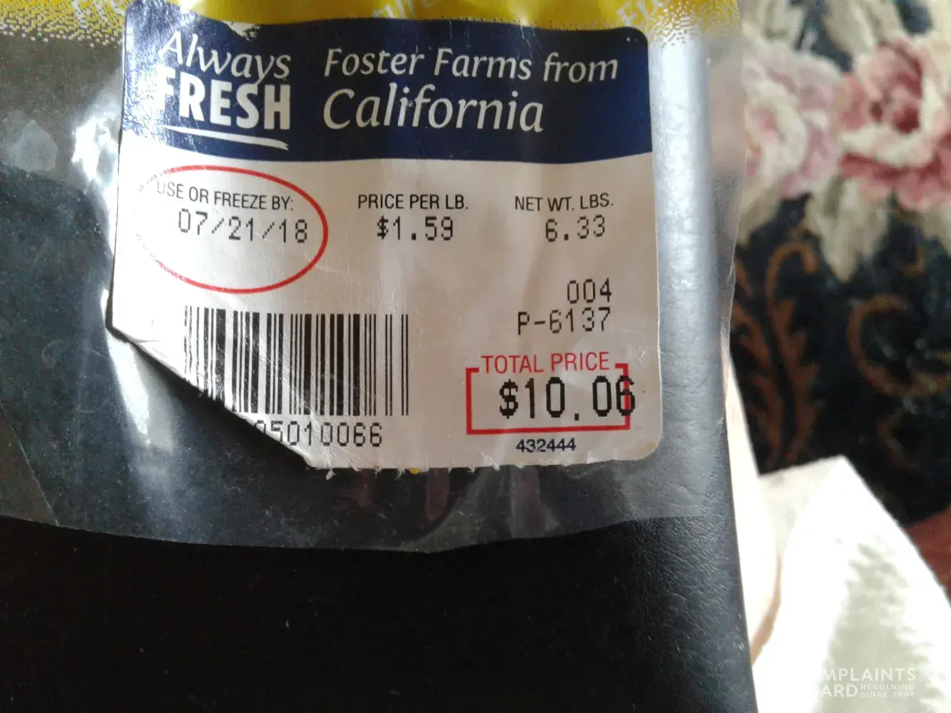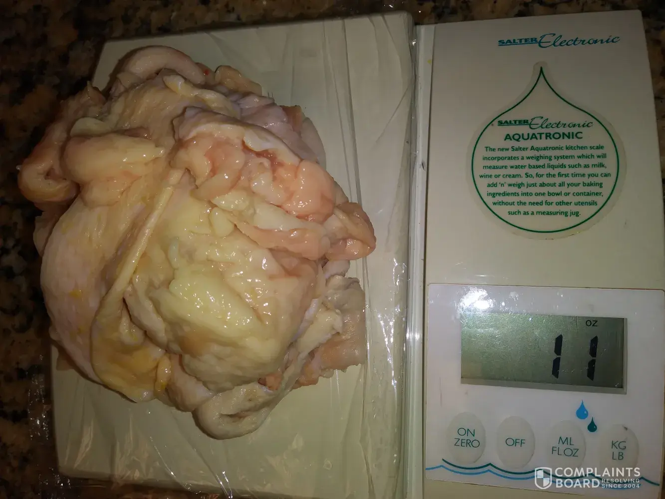 I only buy Foster Farm Chicken products. I raise chickens as pets and for eggs, myself, so am very aware of weight. I was quite disappointed after buying a supposedly 6.33 lb chicken and knowing it sure didn't look like or feel like an over six pounder, I decided to weigh it on my professional food scale. I was aware there might be some difference minus the blood, after removing it from the bag but NOT the amount of difference I found! When a recipe calls for a 6 -6 1/2 lb chicken and you think that's what you're getting, the time cooking and seasoning will be quite different when what you really have is a 5 POUND CHICKEN ! That's right, the Foster Farm Chicken was labeled 6 .33 POUNDS BUT REALLY WEIGHED 5. 74 ! I couldn't believe it. I also weighed the saturated bloody/water enclosed plastic sealed package, that looked to be stuffed with paper towels and saw that it weighed 1.9 POUNDS ! WOW ! That was quite shocking to find that I was paying for 1. 9 pounds of bloody paper towels ! I certainly can't eat that, so I don't know why I was made to think I was getting and paying for a much​ larger chicken. I didn't bother weighing all the bloody water that was also enclosed, I did think it was an amount more than usual. Is this standard for your company? Am I expected to guess how big the chicken REALLY weighs upon purchasing? I thought it would be plenty for my family at the labeled weight, but it wasn't. While I would expect some slight difference, I wouldn't have expected such a huge difference. Could you please enlighten me how the weight is decided and how should I contemplate further purchases in regards to knowing what the chicken really weighs?