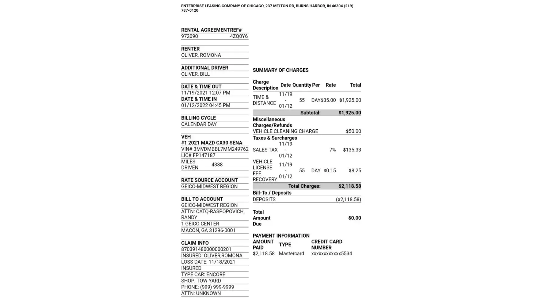 Desired outcome: I would like to recover the total cost of the repair to my car and car rental.