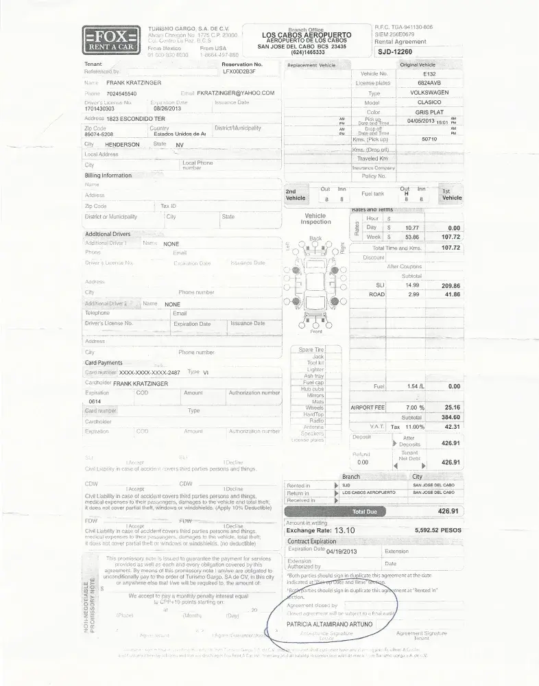 The final bill amount was for $426.91 (invoice number SJD-12260) even after I signed a separate VISA waiver for Mexican auto insurance which was ignored at checkout.
