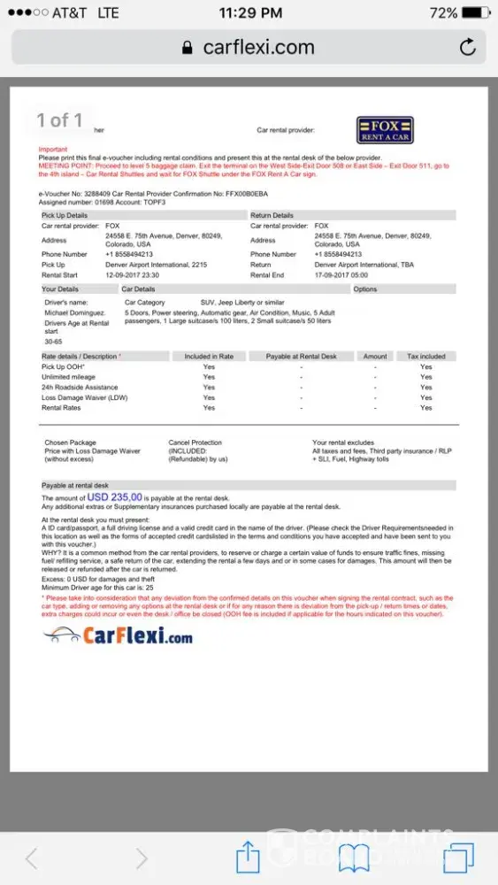 I made this reservation through your company and my voucher was not honored at Fox Rent A Car. The employees at the rental office told me my voucher was irrelevant to them and any payments made through the third party were booking fees and the reservation was irrelevant. The associates name was Isaiah. I would like my refund for the down payment. My Name is Michael Dominguez, my phone number is [protected] and my email is [protected]@gmail.com. Thank you.