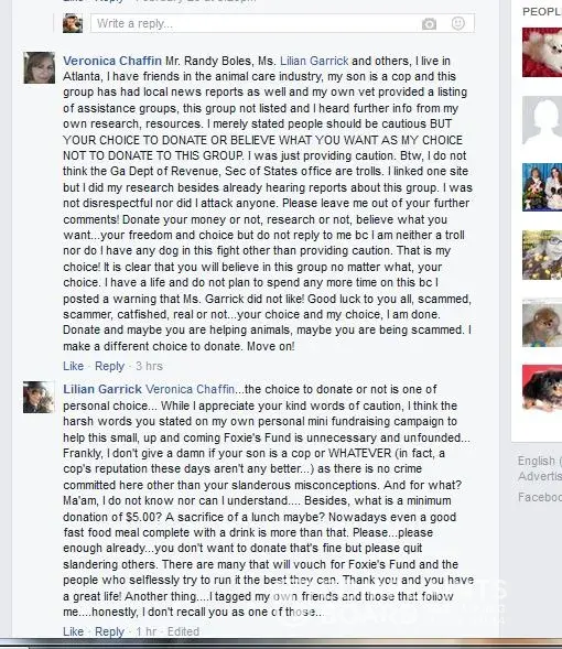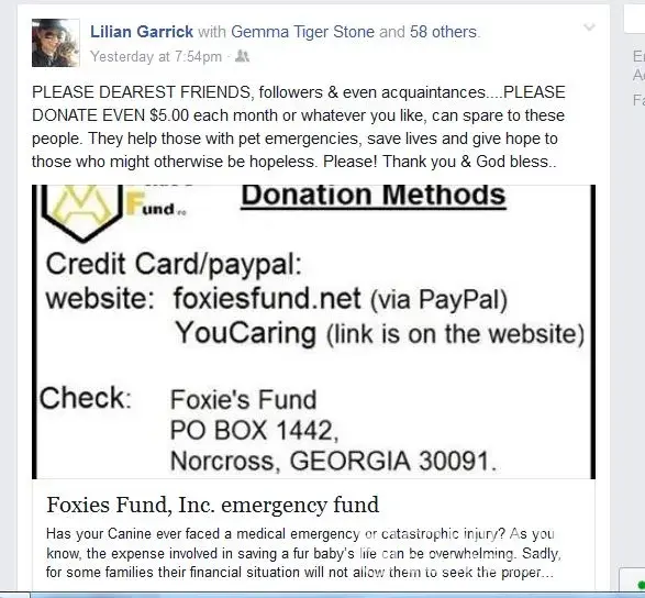 There are way to many Shady Characters that play a roll in the Foxies Fund collection Army to even trust these individuals with donations going thru their hands, Like the Cyndi Pomlover broken dog leg case, really who in their right mind would donate to such a bogus name and scam set up, The Tiffany Tadlock Lucy case also took our investigation Team eye Art Smith creating a Facebook in the name of the dog Lucy Tadlock, Thousand was collected off Lucy, But now she has up and disappeared with no updated post on her condition, When Art Smith, Dominick Tambone, Randy Boles or Lilian Garrick was questions about certain clients, They always used this Michael's guys name, calling him a troll and the person questioning a troll or saying he was attacking their group, When fact Michael did not know these people, Any legitimate ran 501c3 if asked questions about where there donations go to should be happy to forward information.Art Smith, Lilian Garrick, Randy Boles, Cynthia Foster alais Cyndi Pomlover are all Shady Characters, including Foxies Fund newest scammer revial Sarah McGuire alais China McGuire which has not one, but two accounts in the new Foxies Fund group she also runs a Facebook page called CHinas Magic Massages that looks like the sex trade business, The first group Art Smith claims to close it down to have a public group, when all she had to do is take out members down to 4999 members in the group and change the Facebook setting to public, She close it down to create the new group under her name Art Smith, The first group was created by Dominick Tambone yet another very shady and suspicious move from this Norcross Georgia based 501c3 fraudulent organization. Screen Shots provided prove they are very Shady Individuals
