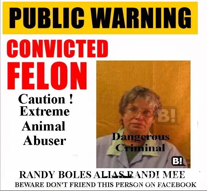 Once again randy boles caught in lies what else you expect from a con women this man dodd never had a felon record period or felon arrest the screen shots prove be on a doubt that randy boles pastrd out a web page suggeting beating, drowning and roasting dogs, this woman should be back in jail where she really belongs as her twin sister robin raab says she a damaged individulal and has never changed